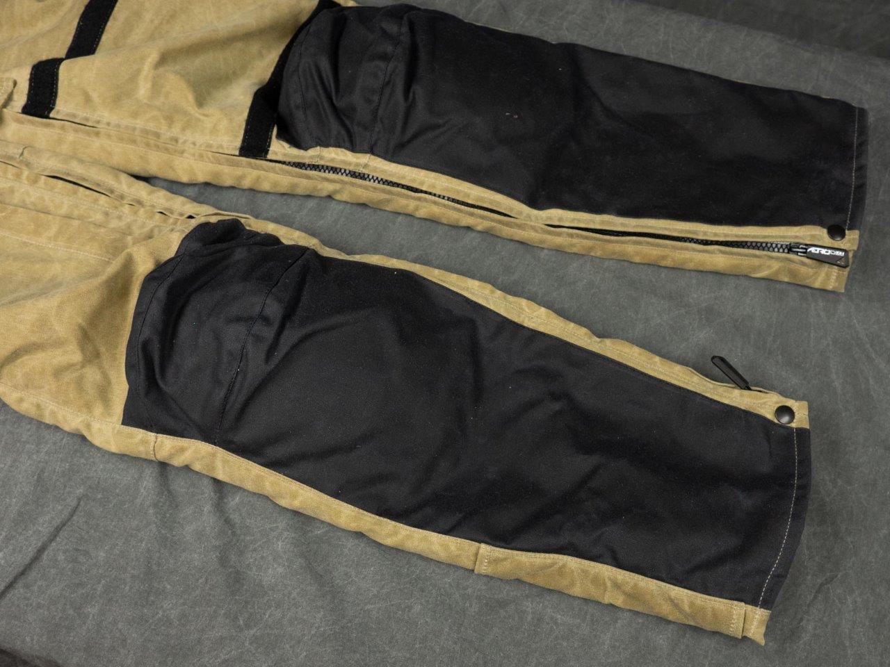 At the back, there are two large pieces of hook and loop for attaching the bottom of one of Aerostich’s back protectors. These really only come into play if the pants and jacket are zipped together.