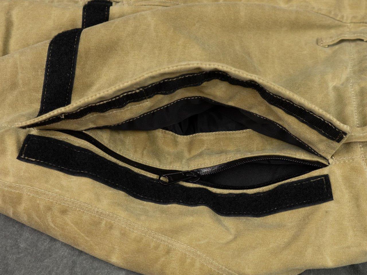Rounding out the pocket options is pair of hook and loop strips on the left thigh. Aerostich offers a clear panel map pocket that fits here that can be used for maps but could hold other small items as well.