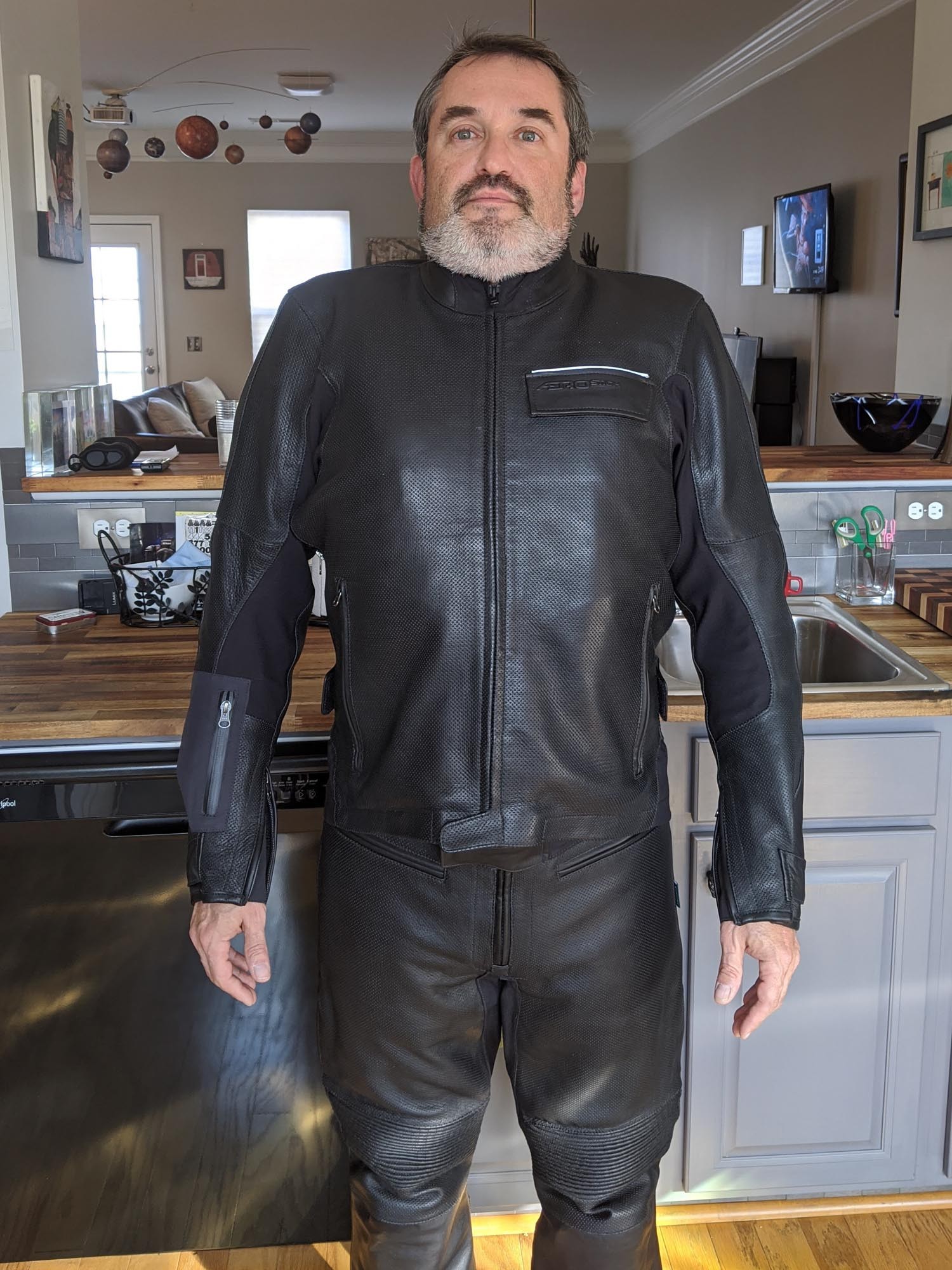 But I’ve often wanted something ‘leather’ since during my road racing times and crash(es) I never had any road rash or broken bones. So I’ve wanted leather even though I’ve owned and worn Stich Roadcrafters and Dariens for some time. It appears from your sizing we are about the same size so thanks to your mom and dad for that too.