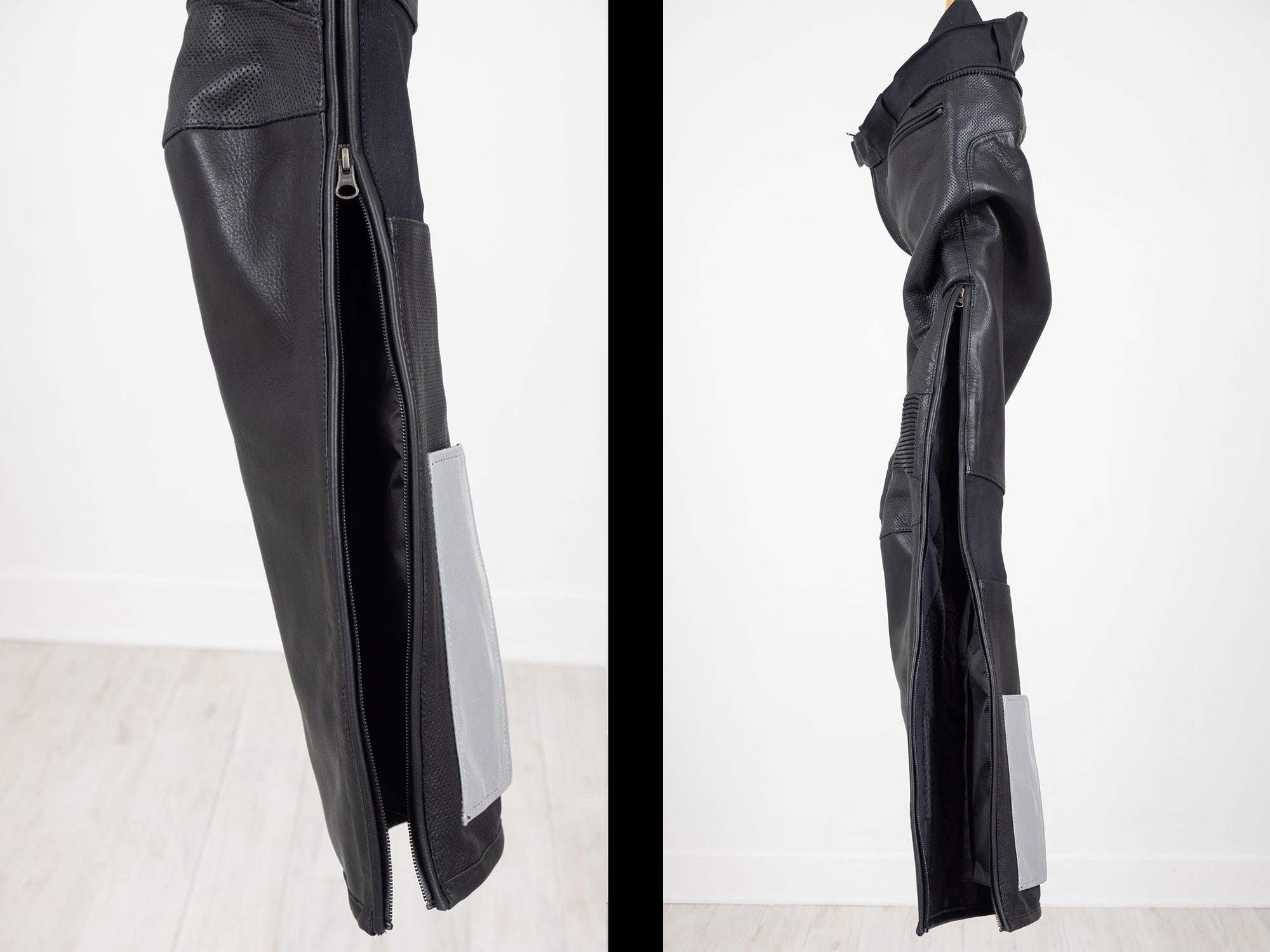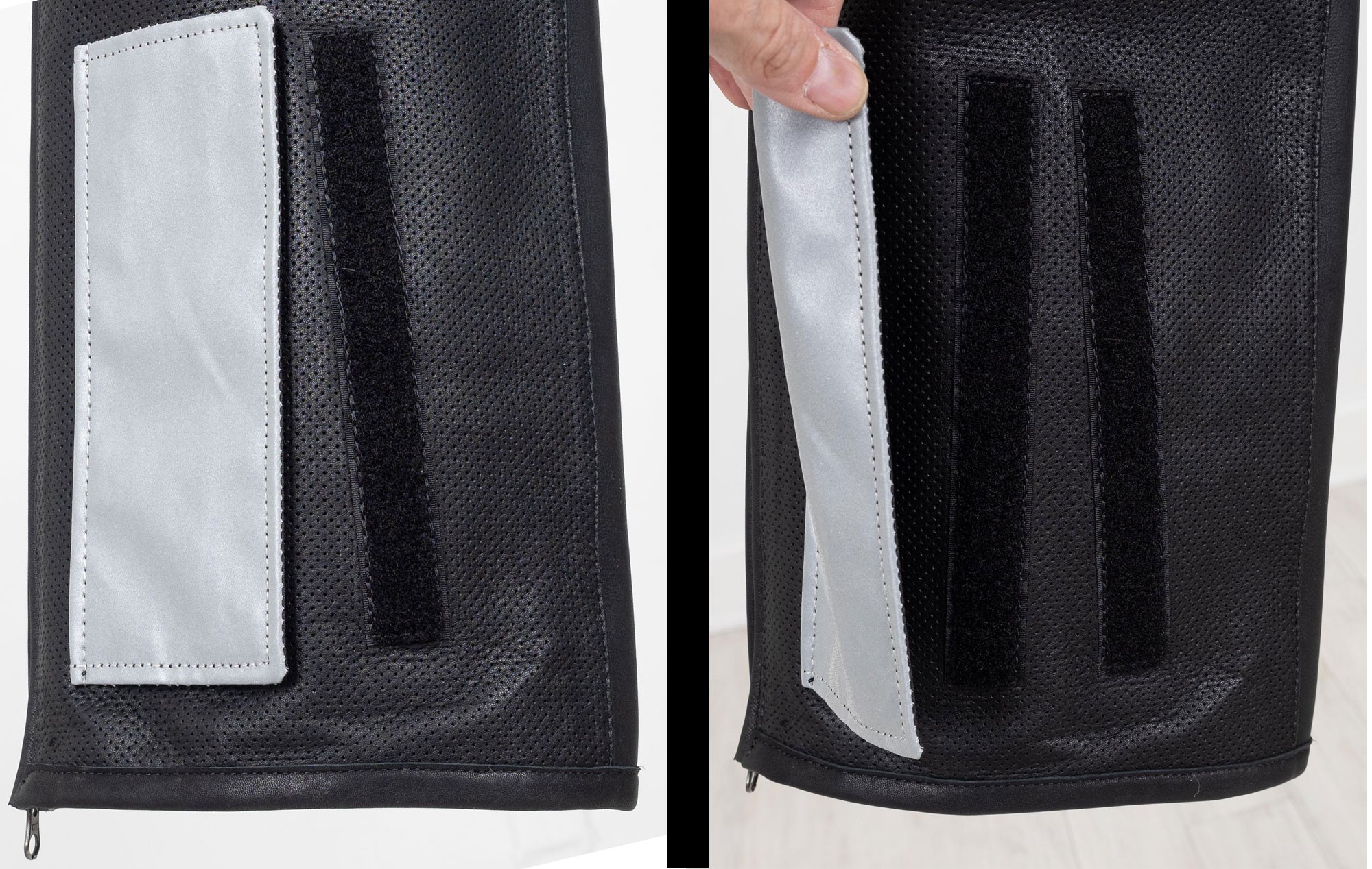 Leg openings are adjusted via these hook and loop fasteners hidden under the reflective areas