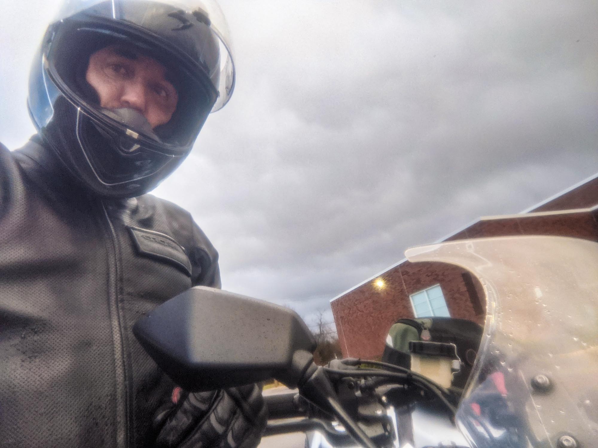 A brief stop during a rainy ride to test the waterproofing of the Transit 3.0 suit