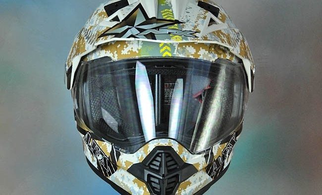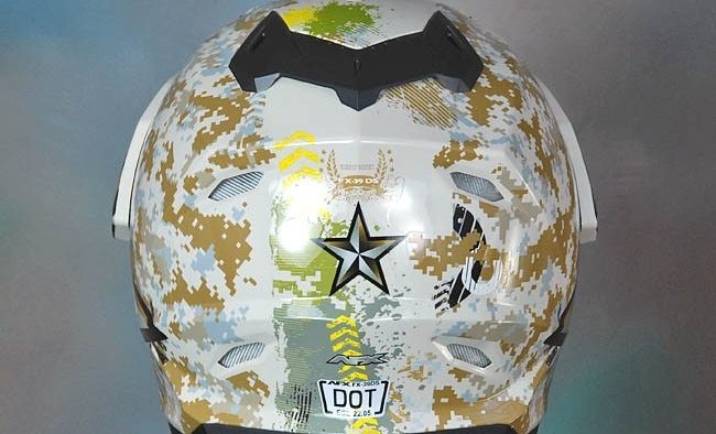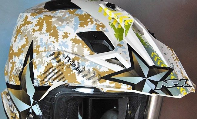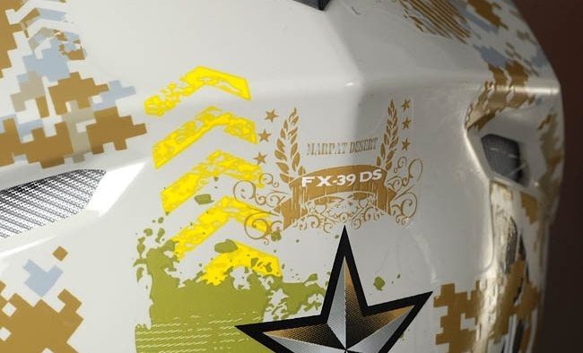 The camo pattern on FX-39 is a decal, and it has been applied with care to this helmet. I think this is one color pattern that could use a matte finish, which would give it even more of a military/rugged look.