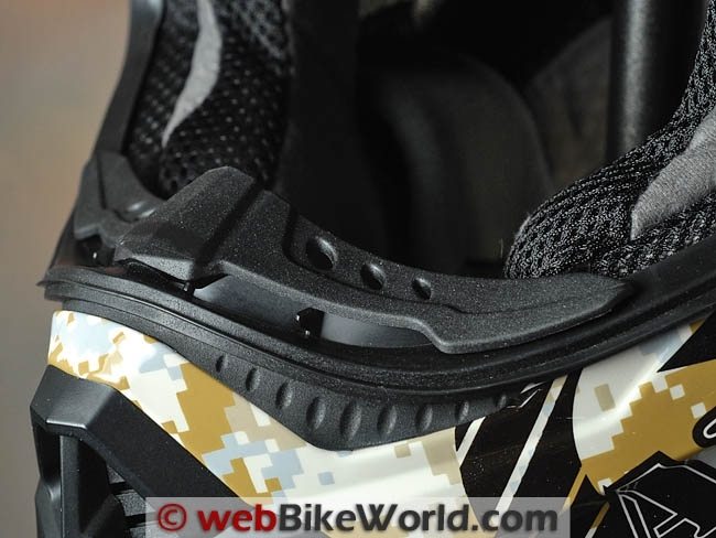 The inside of the chin bar is yet another surprise on this helmet; it’s finished very nicely in a sort of carbon-fiber look cloth. AFX designed a very large intake port through the chin bar and it’s backed with a nylon mesh to keep out the bugs.