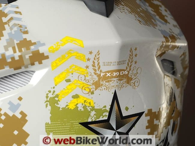 The camo pattern on FX-39 is a decal, and it has been applied with care to this helmet. I think this is one color pattern that could use a matte finish, which would give it even more of a military/rugged look.