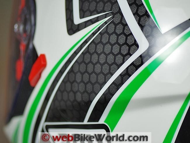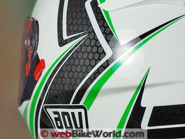 The dark gray sections of the Racer pattern are a honeycomb pattern with tiny silver metalflake paint in each of the “combs”, subtly referencing the helmet shell, which is made from something AGV calls “Carbon Glass”; a fiberglass and carbon fiber mix.