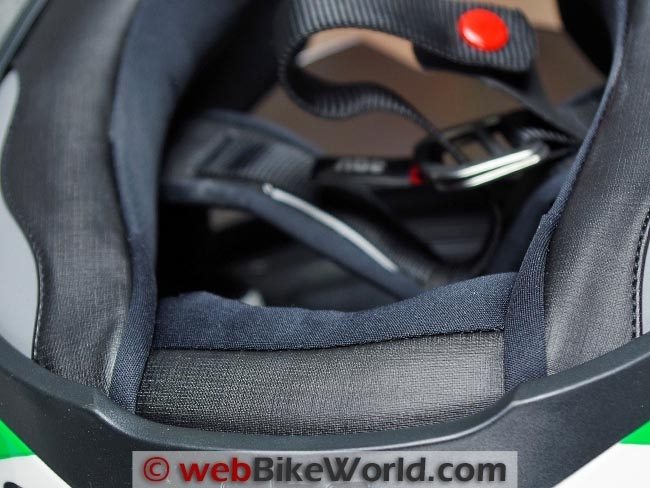 A couple of new fabric types have apparently been employed by AGV, with the bottom part of the liner at the neck roll having a crosshatch appearance looking like a ripstop material (although it isn’t) and a slightly slick or smooth surface.
