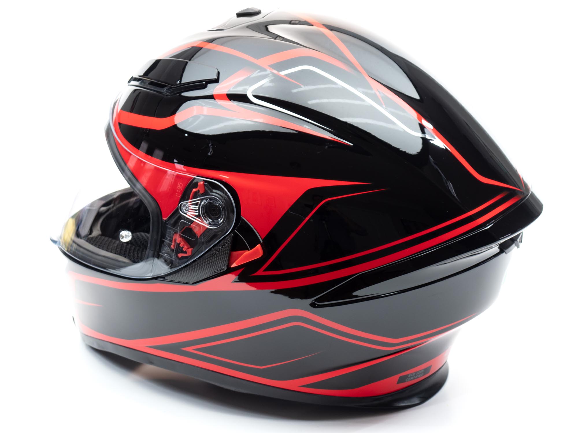 The K5 S represents the top end of AGV’s sport/sport-touring helmets with a moderately aggressive shape. The curves downward providing extra coverage up front. This particular example is mostly black with slim, angular graphics that make up the “Magnitude” colorway.