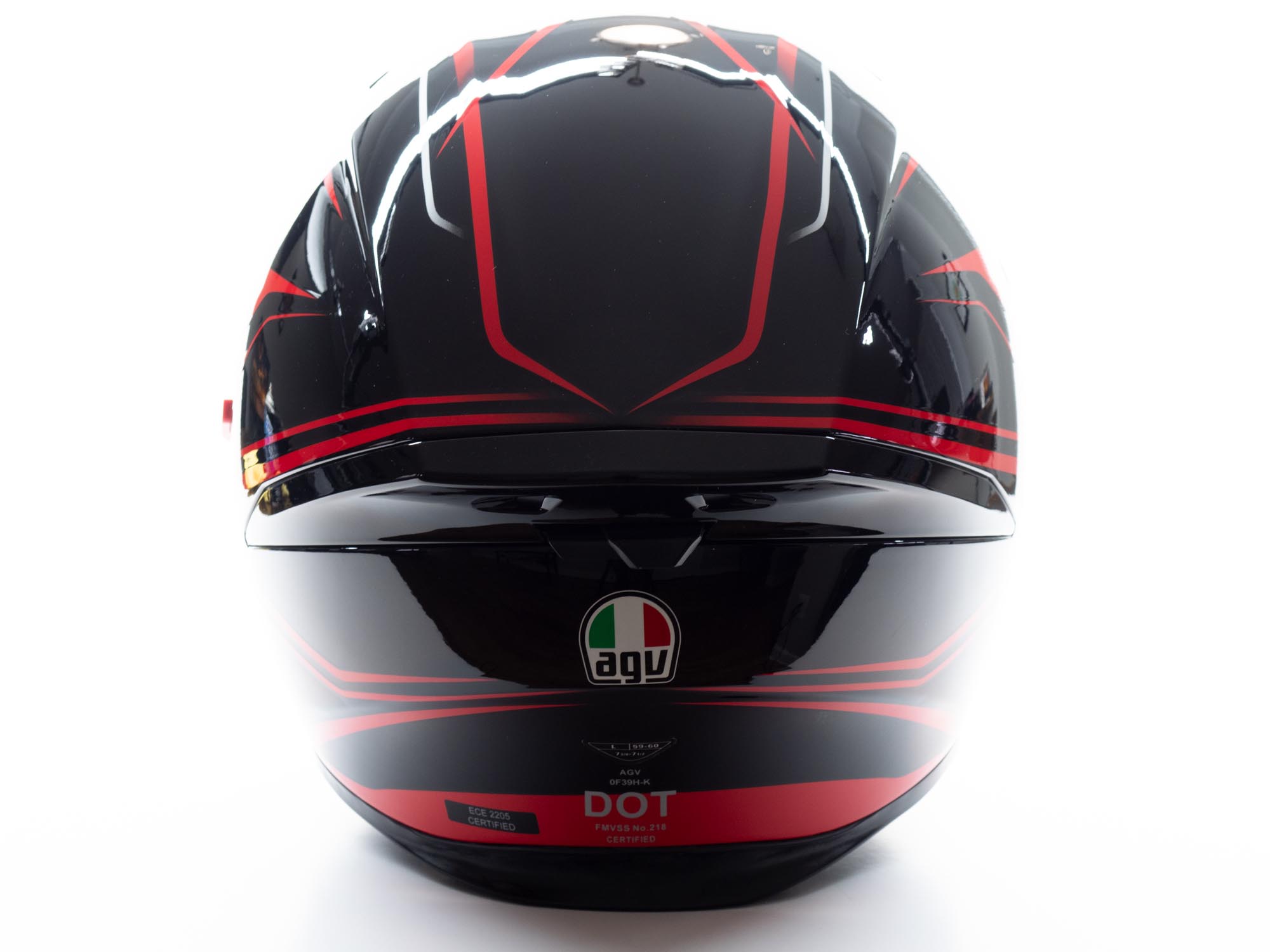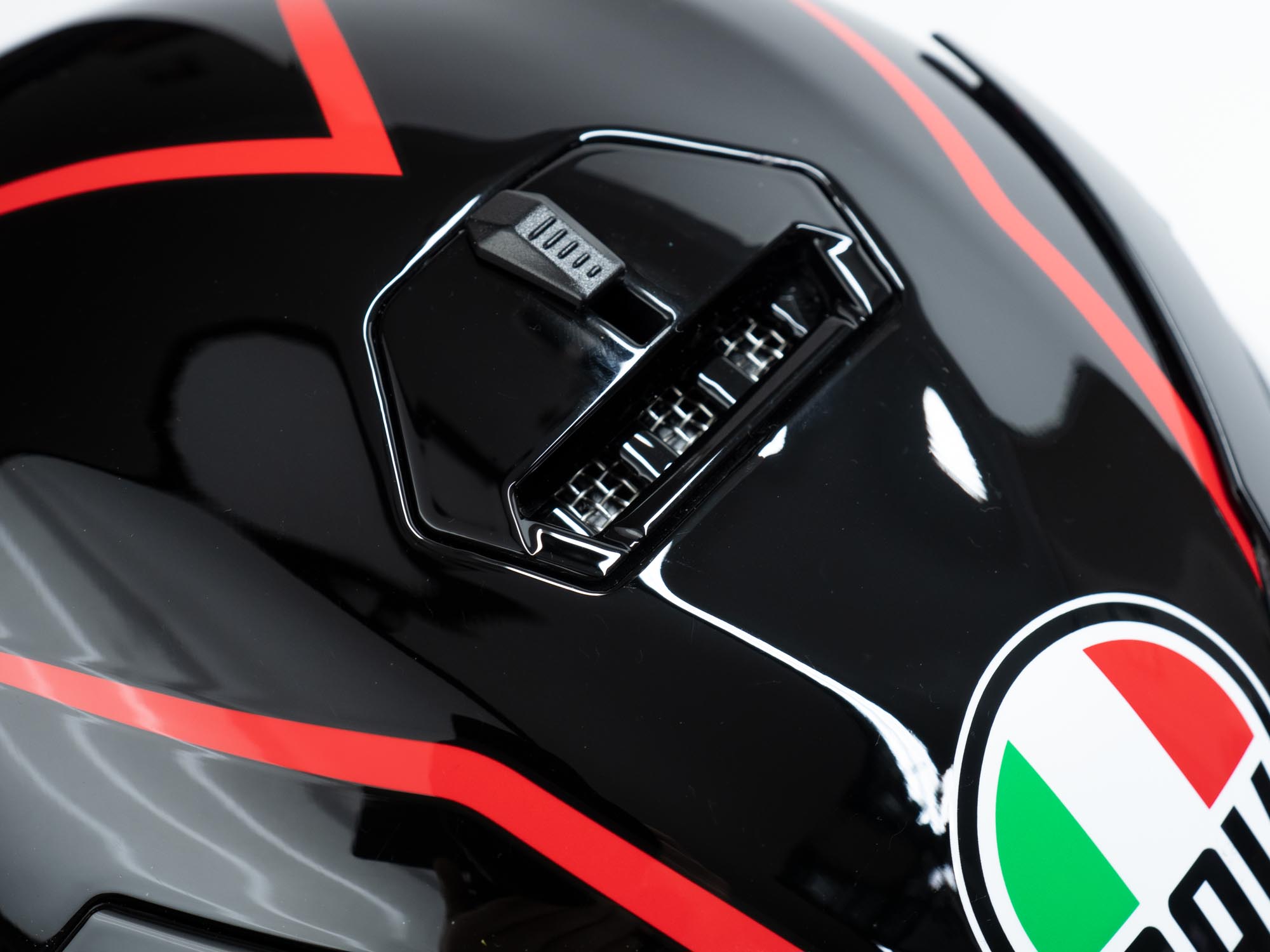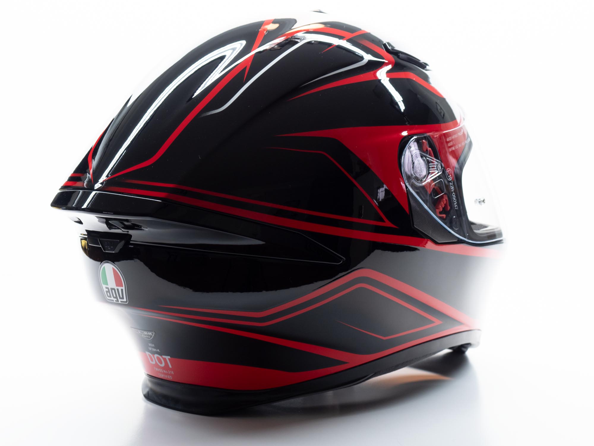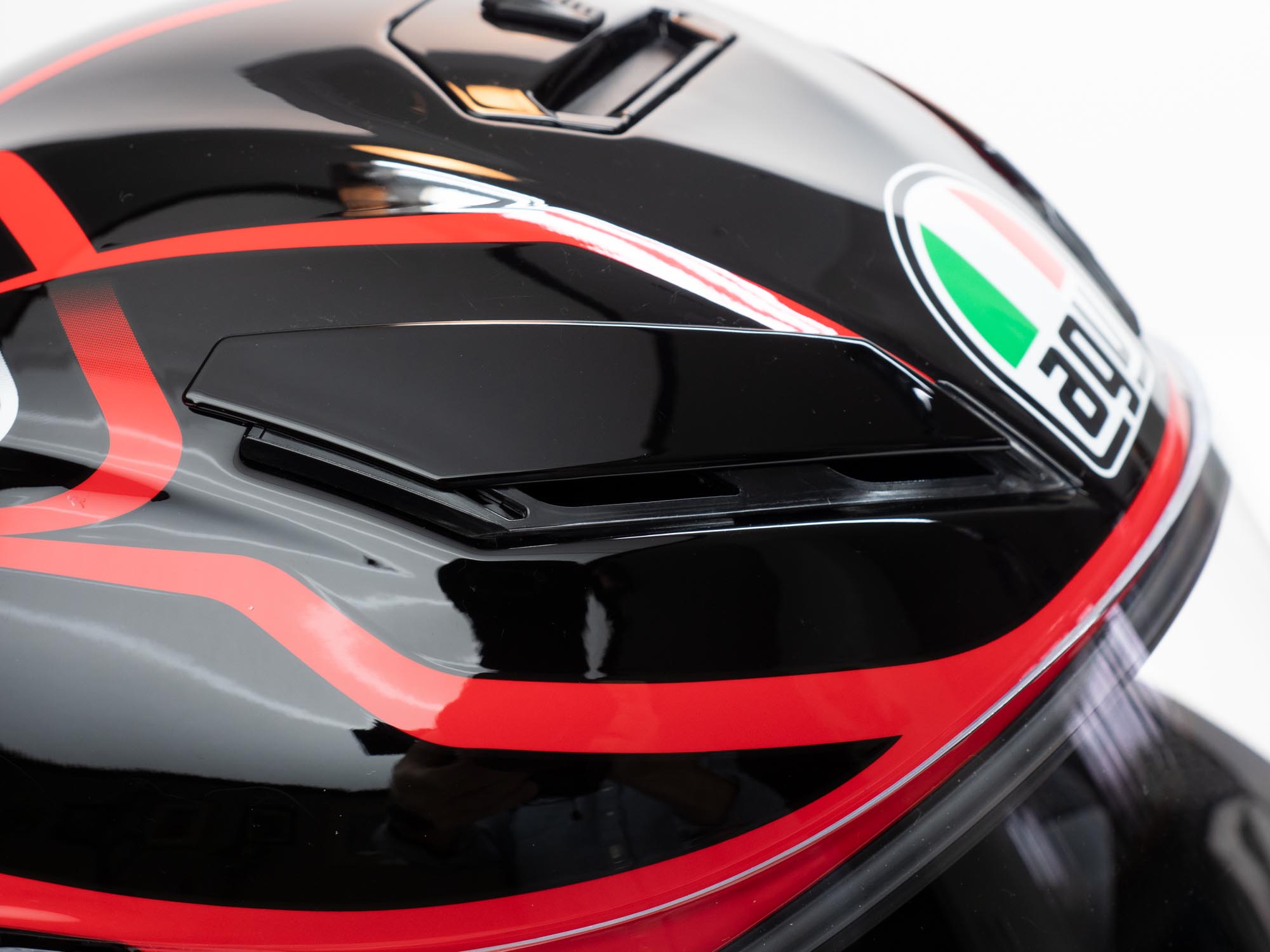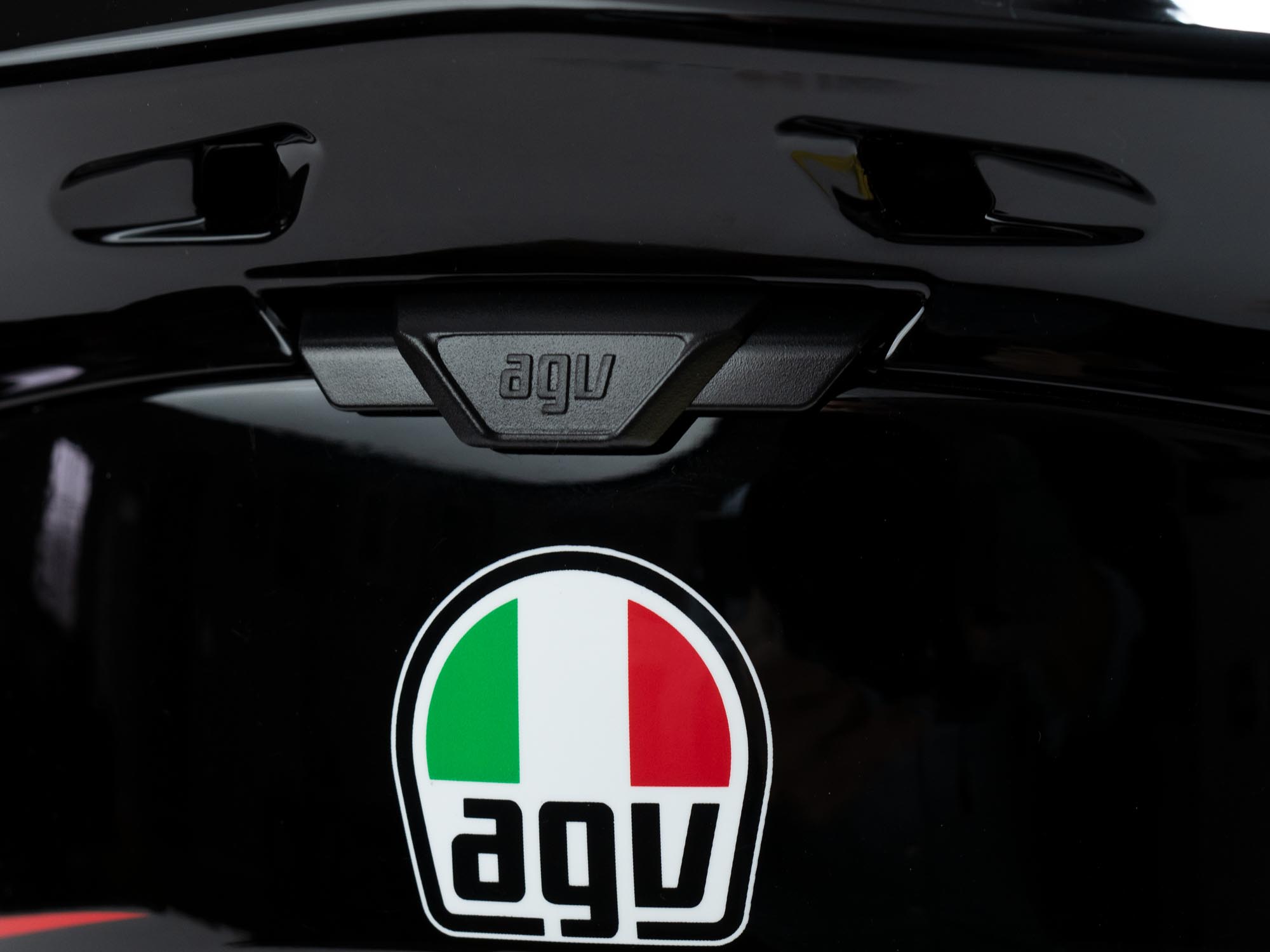 Over the visor, in the center of the forehead space, is the green, white, and red AGV logo/graphic and a smaller version of it appears on the rear under the spoiler. A pair of closable exhaust vents are there under that spoiler and join the chin, forehead, and top vents providing a lot of options for ventilation.