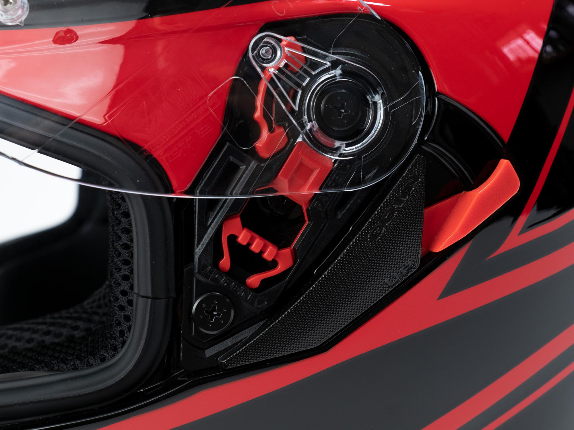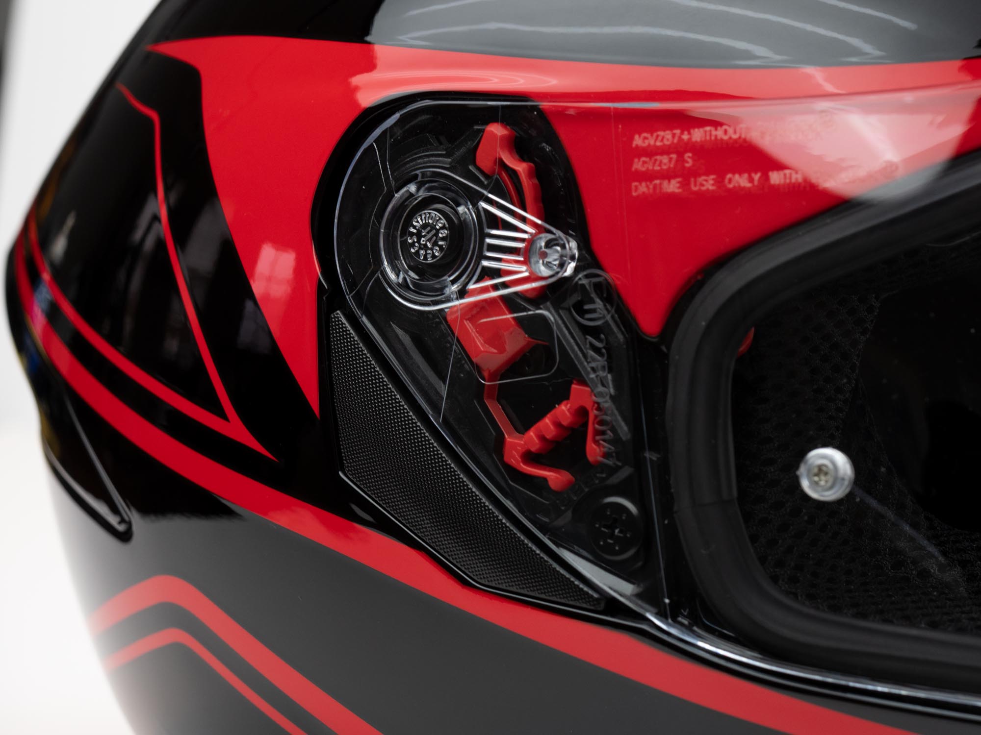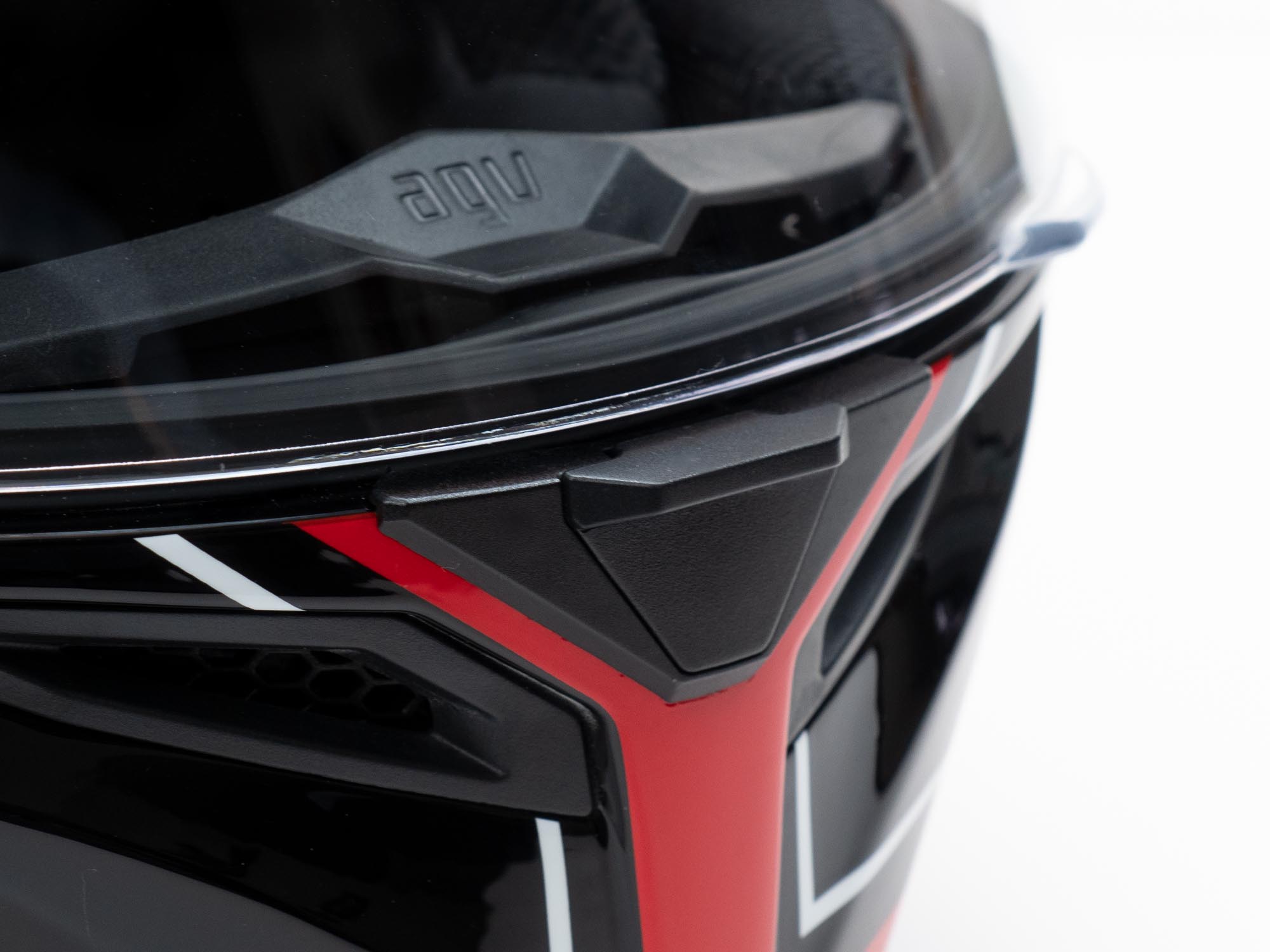 AGV includes an interesting custom adjustment for visor positioning on the K5 S. Included in the box with the helmet are two extra sets of “detents” that can be installed in the side pods. The installed one (in red) provides four positions of opening including open and closed. The initial opening is pretty large at about two inches (about 50mm) making the demisting slider necessary to have a tiny opening.