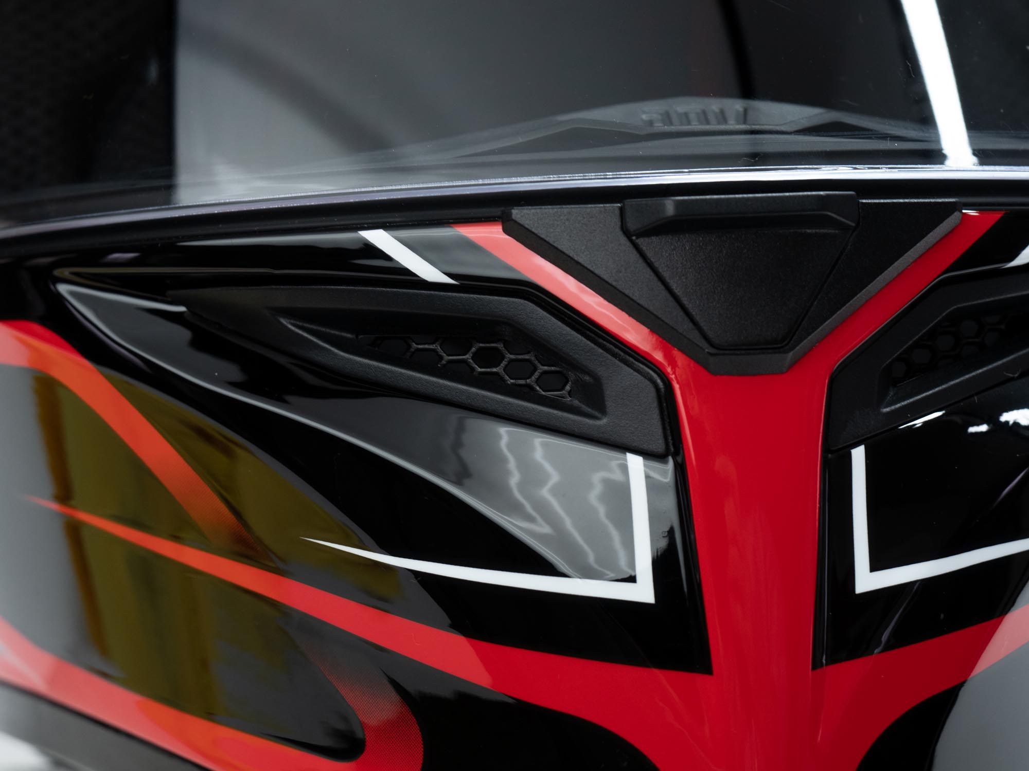 In the rear, under the spoiler, are a pair of exhaust vents that open and close with one centrally located switch. The switch in this position opens and closes very positively with an audible “click” which is helpful since one has no hope of viewing these ports when wearing the helmet. This switch has raised edges making it easy slide once one is done reaching around the back of their head to find it.