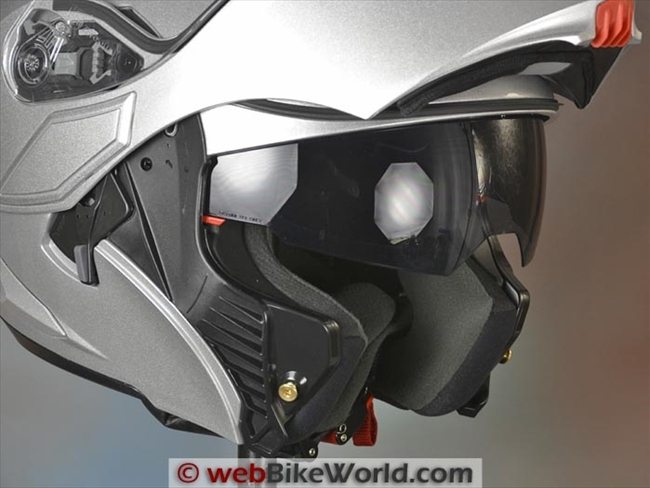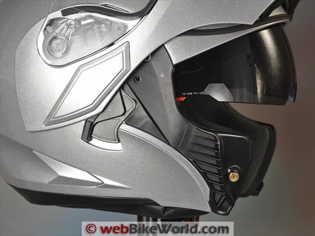 There’s a locking lever on the right-hand side that locks the rotating flip-up visor in place in the raised position, allowing the helmet to be worn in that configuration in its “Jet” mode in Europe only.