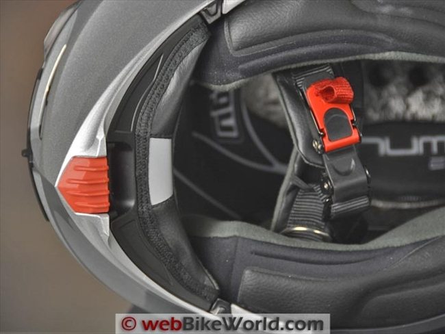 Combined with a very stiff return spring, it sometimes takes two hands to release the visor — one to hold the top of the helmet down and the other to yank on the release.