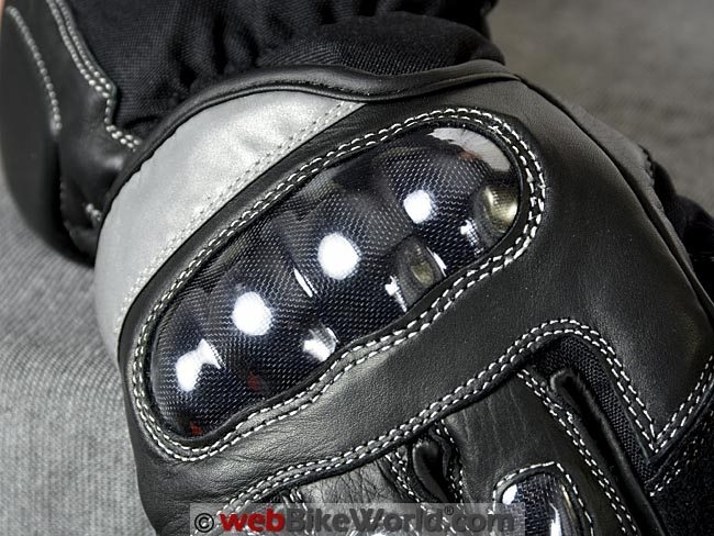 There are 5 clear plastic covered mesh knuckle protectors over the outer three fingers and a large “floating” main knuckle protector uses the same type of construction.