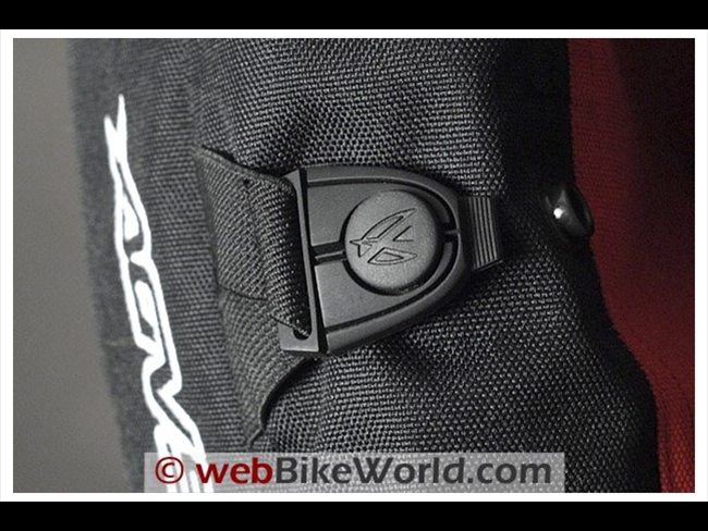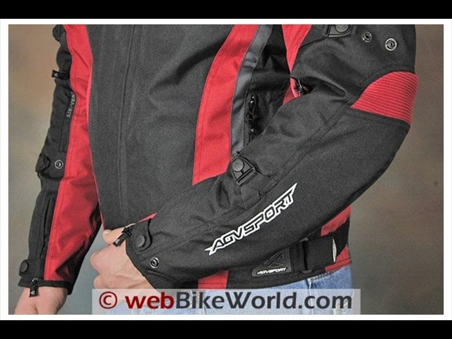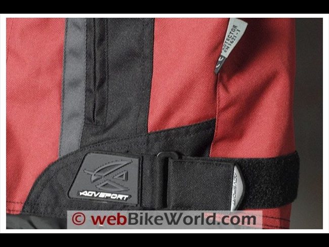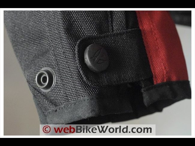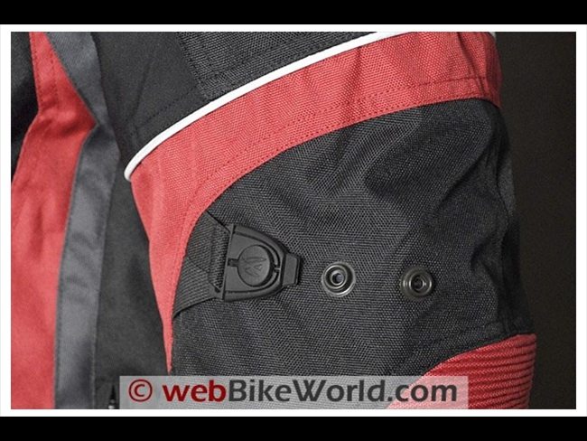 The Tempest jacket has adjusters on the upper arm and forearm. The adjusters are camouflaged black to blend in with the black material, but they are nicely styled with rubberized snaps attached to short sections of elastic.