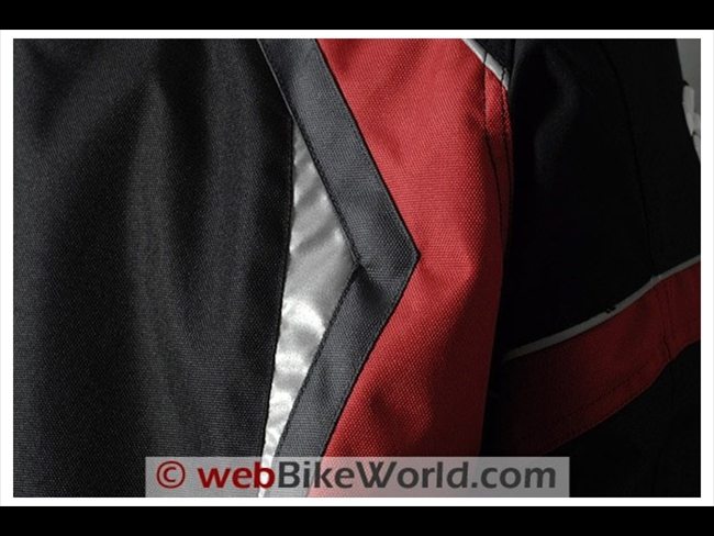 Illustrated in the photo above, the Tempest jacket includes highly reflective strips of reflective piping along the upper chest, back and arms, with additional reflective material sewn in as a dart behind the shoulders.