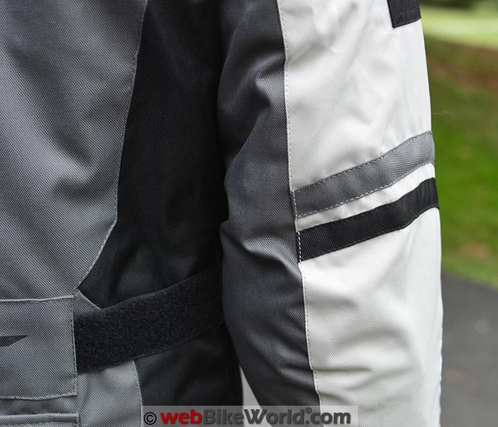 The Torino jacket has two-snap adjusters on the upper arm and forearm with rubberized snap covers. They are not elastic and since the first snap is the “home” position, there is one more adjustment by using the second (inboard) snap.