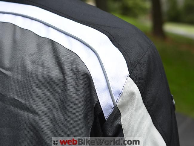 Illustrated in the photo above, the Torino jacket includes a few reflective strips of mildly reflective piping along the upper chest, back and arms, with additional reflective material on the sleeves.