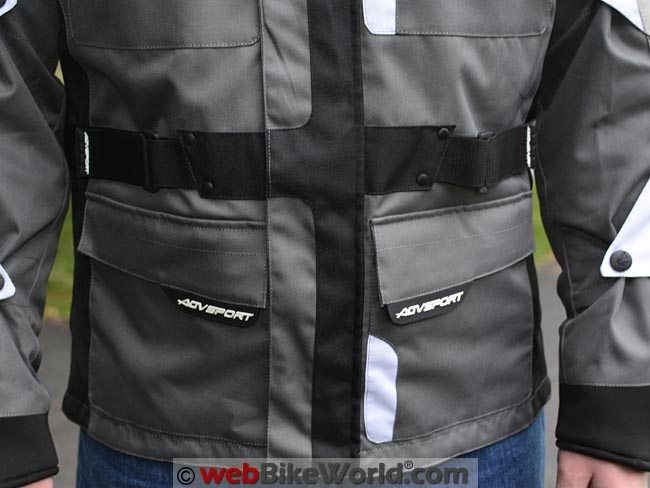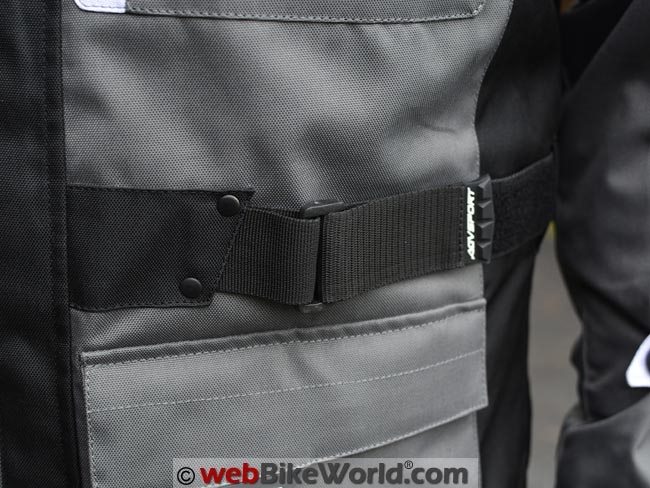 The Torino has a very nice waist adjustment system, with a 40 mm wide strap with hook-and-loop. It feeds through a square “D” ring on either side on the front of the jacket.
