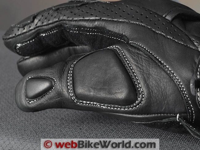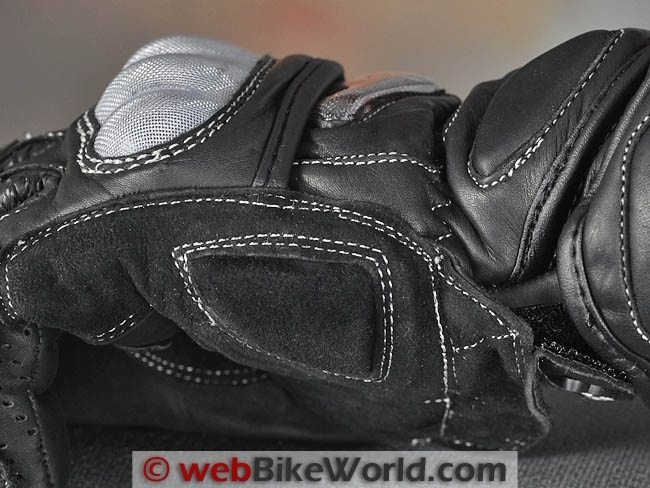 The palms, the inside of the thumb and the outside of the heel of the hand are all covered with separate sections of buckskin-type leather. It also covers the underside of main knuckles on the palm.