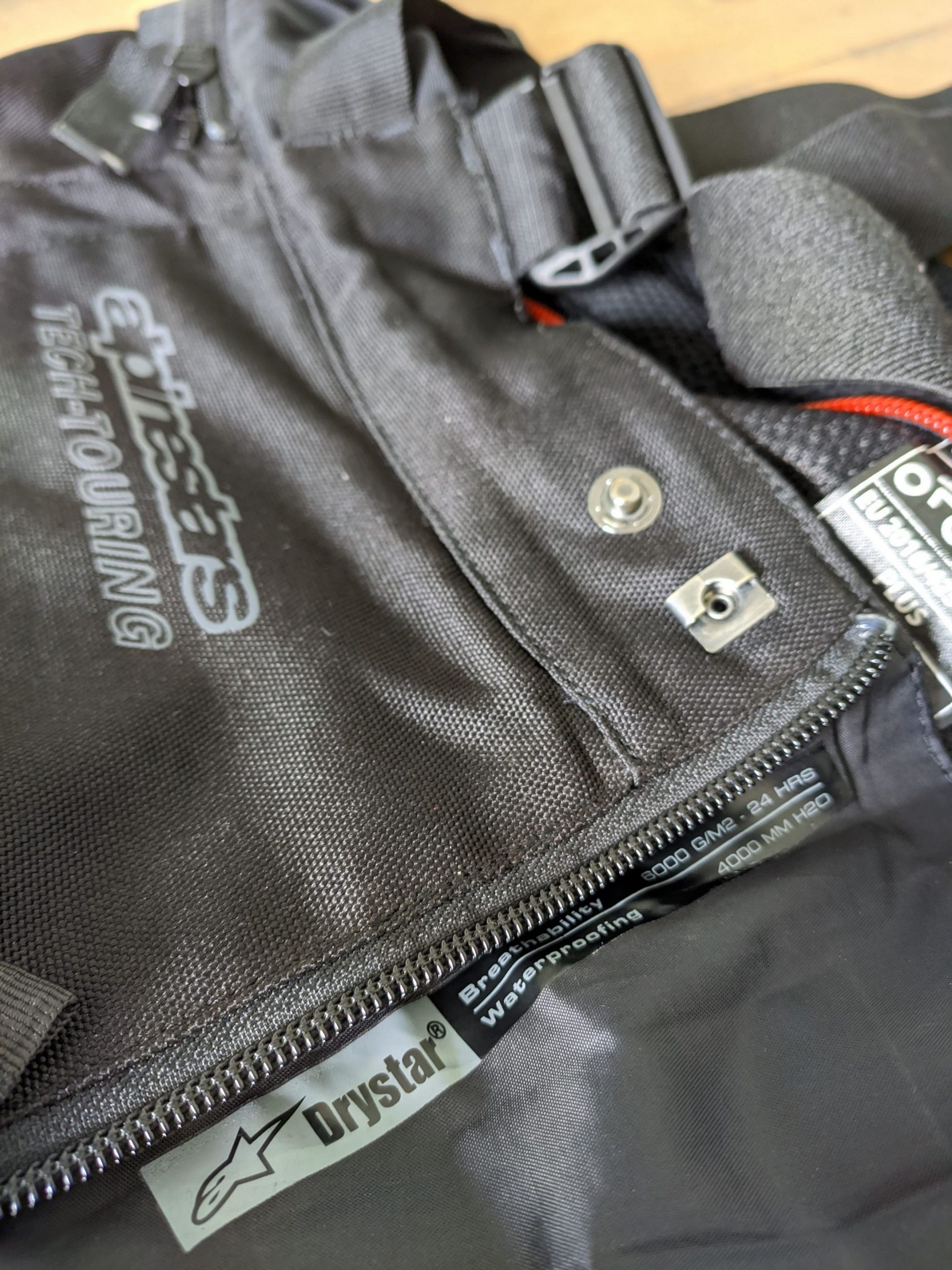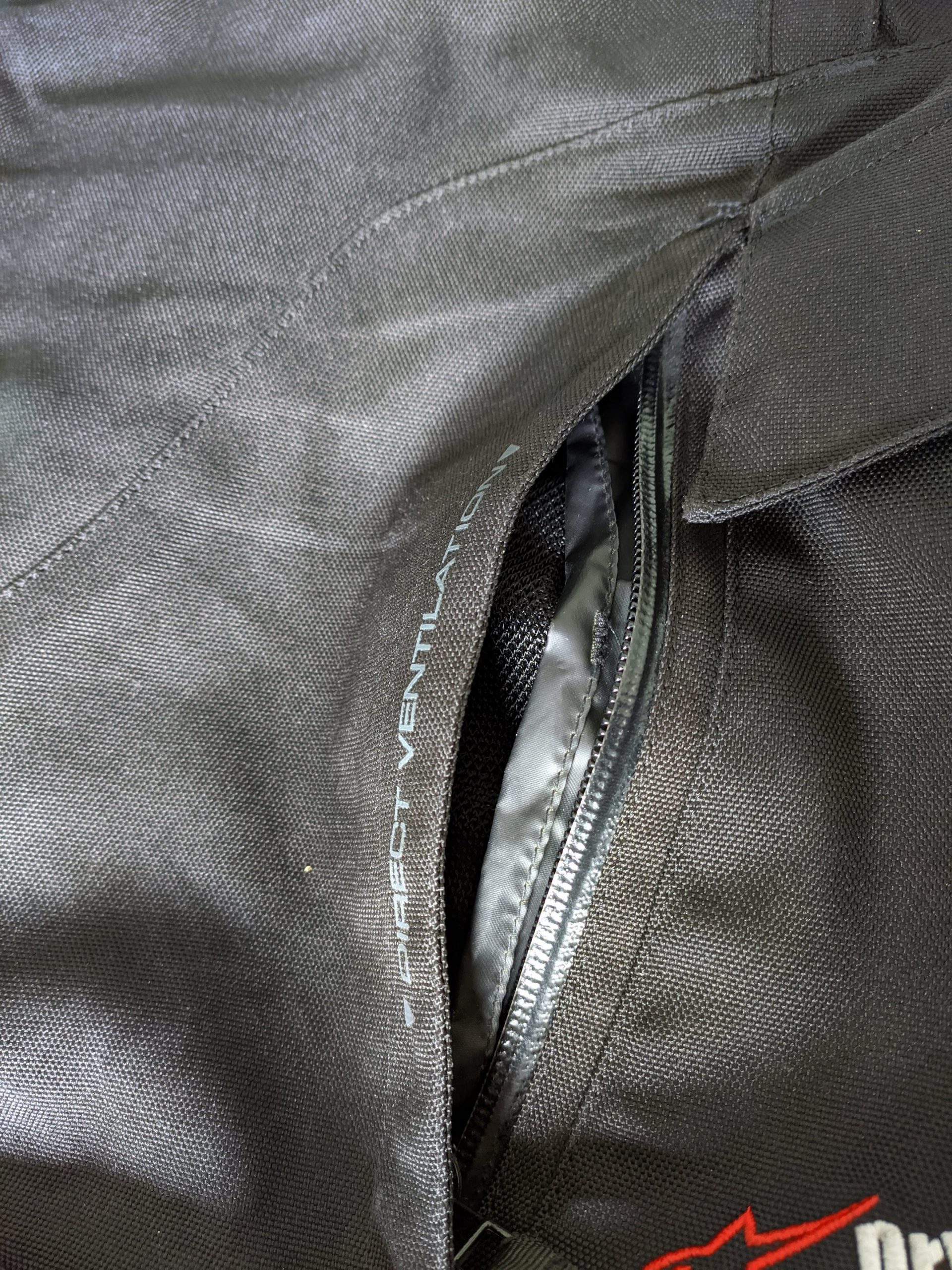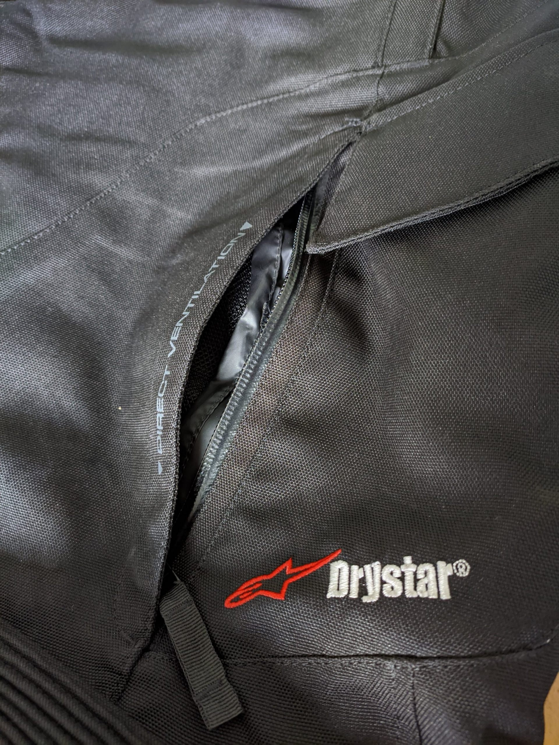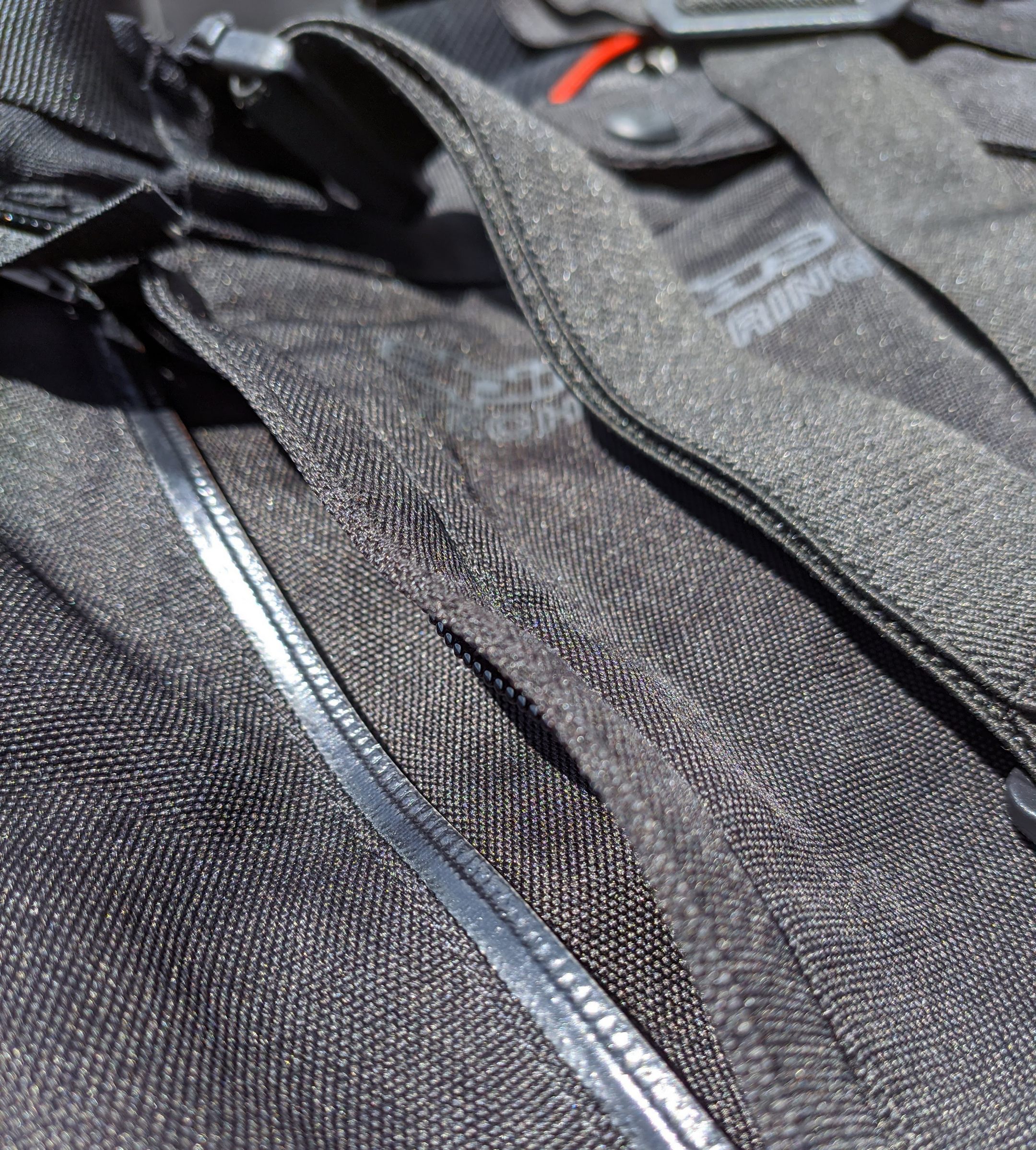 These waterproof zips, which have tags to make them easy to open with gloves, are also used for the vents which direct air towards your thighs and work pretty well, even on fully-faired bikes. Beware of the excess fabric behind the zip though as it can get caught in the runners.
