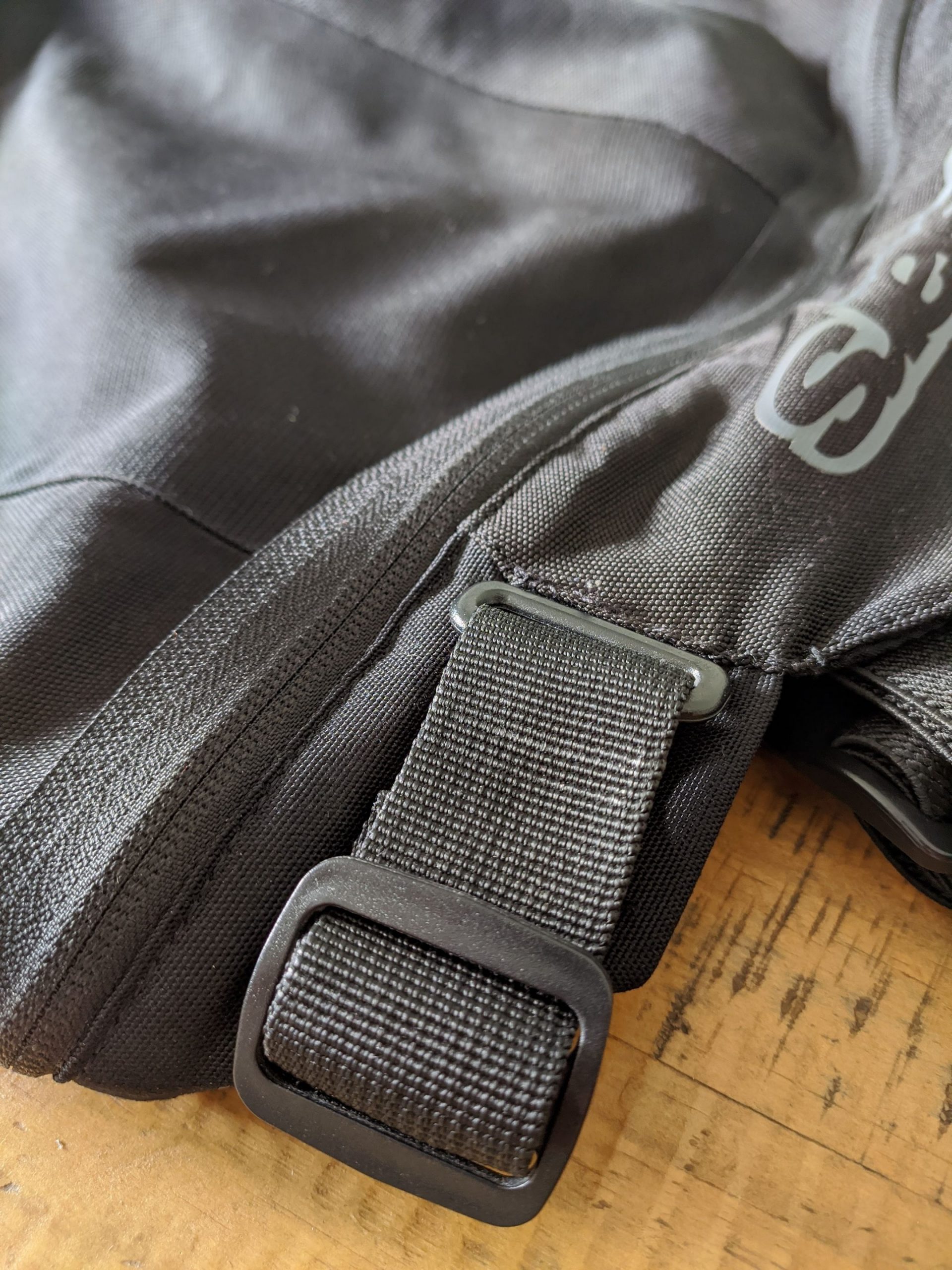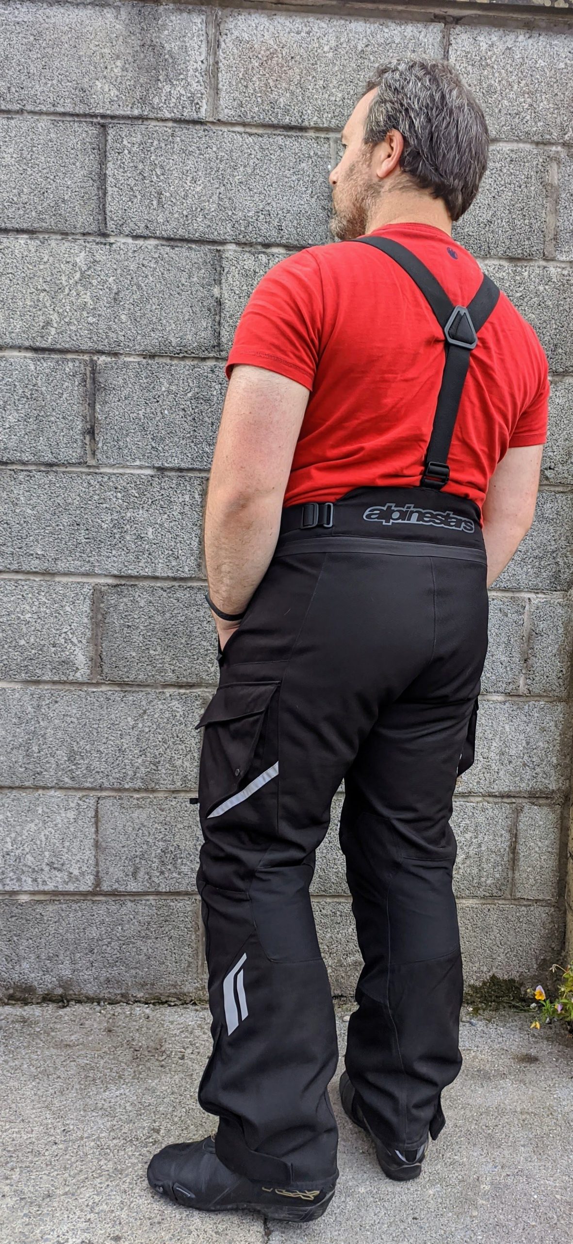 That’s right, Alpinestars included braces on the Andes II. They’re wide enough that you’ll barely feel them around your shoulders and elasticated enough to ensure a bit of expansion when walking or moving about. I find these to be especially useful when wearing a pair of jeans underneath the trousers. Rather than squeezing the life out of our midriff with two sets of trousers, you can let the Andes II ride a little loose and still keep them up with the braces.
