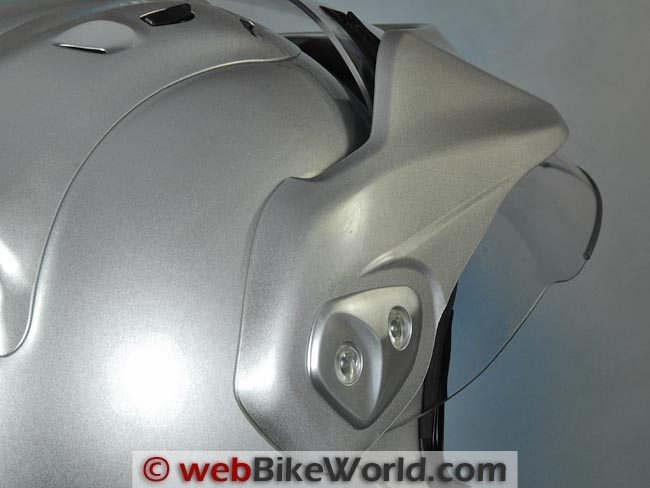 The face shield also has the dual Arai vents at the top, which don’t seem as effective on this helmet, probably because quite a bit of air flows up from underneath, due to the design.
