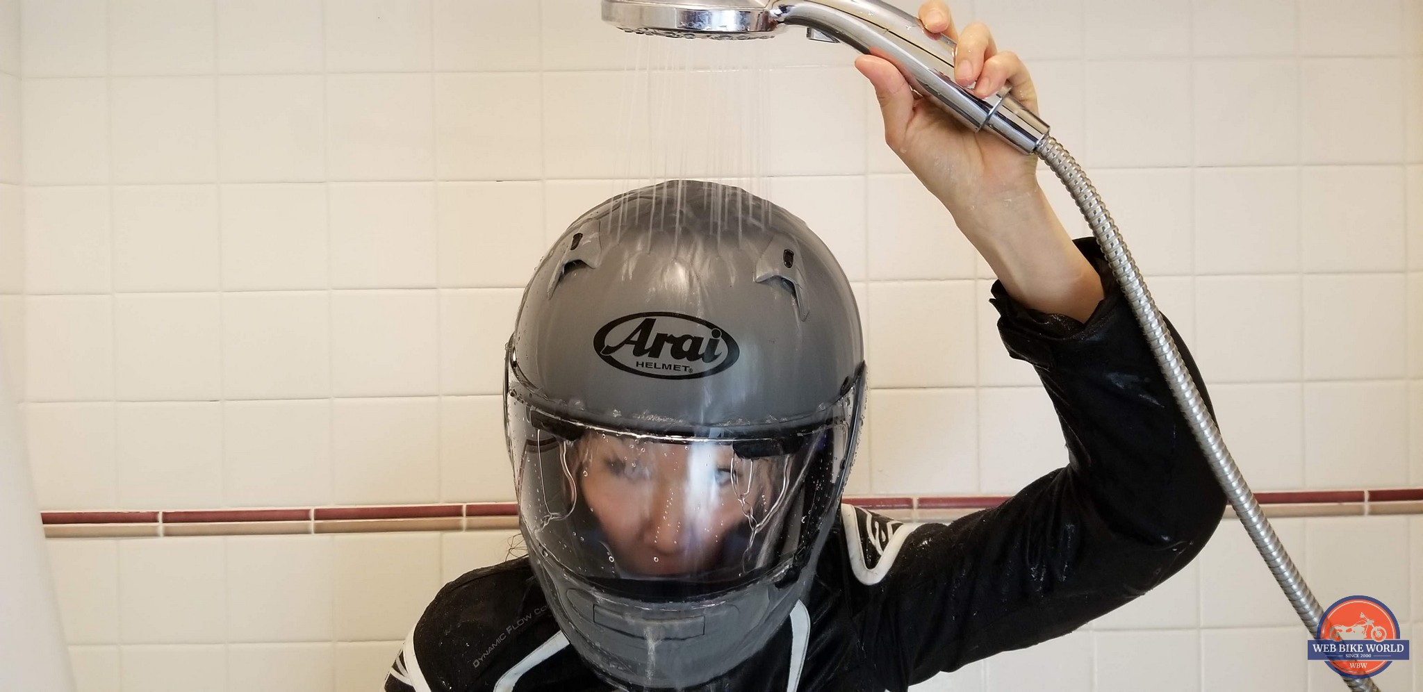 I had a chance to ride in the light rain with this helmet. It was a rare occurrence during my summer in San Diego. However, the rainfall was very light, so I did a mock rain test in my shower. The photographer was laughing uncontrollably during this photoshoot, but I can attest without a shadow of a doubt that the rubber seal on the visor is water-tight. Just remember to close the brow vents!