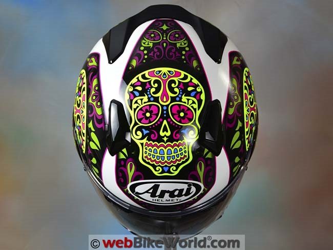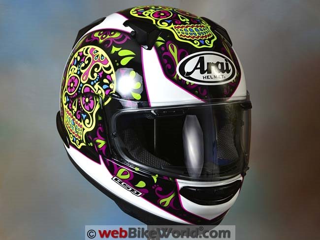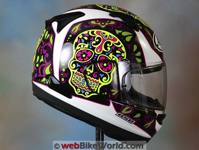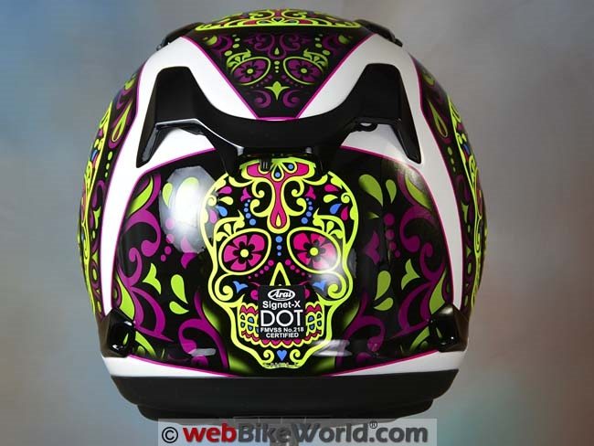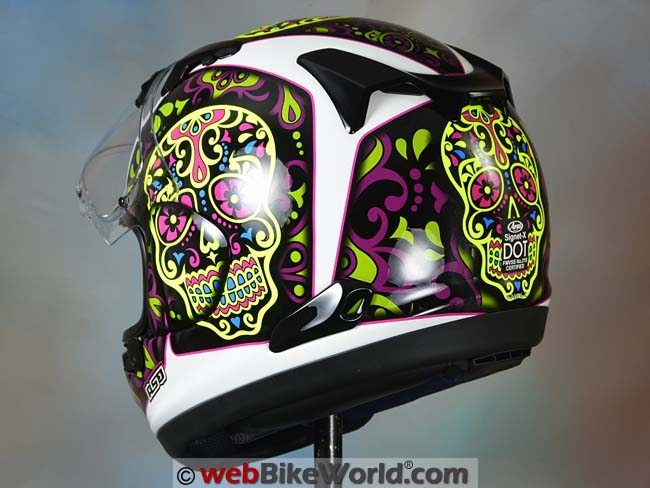 “The Narrow X For The Cranium”. OK, so it’s my attempt at cuteness using a very limited knowledge of Spanish. But this new Arai Signet-X in the “El Cráneo” graphics does two things really well. First, it gets you noticed. And second, if you’re a member of the Arai “Long Oval” club, this is your helmet.
