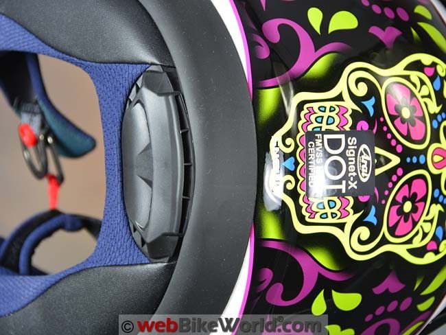 The Signet-X has the same three-hole (on the inside) rear exhaust vent array with a single lever for opening and closing a sliding cover over the dual vent holes. It’s a two-position slider but position one (supposed to be half open) isn’t much different than fully open. This may be a production issue on our particular helmet.
