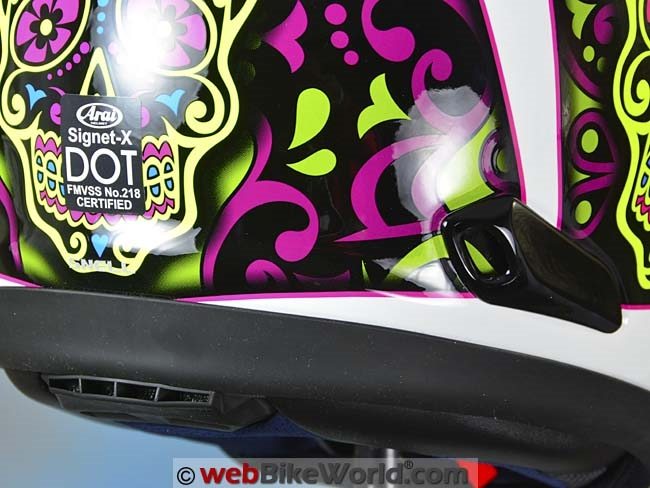 The Signet-X chin vent is standard Arai. It’s what we call the Arai “sugar scoop” (or “feed scoop” for you ex-dairy farmers) type that pours air directly through the chin bar and through a mesh filter bug catcher and then on to your face.