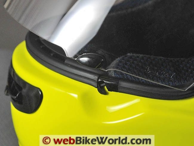The face shield is infinitely adjustable, more or less. The Arai side plate system doesn’t use detents, which is an advantage because it allows the face shield to be raised to any position and held via friction.