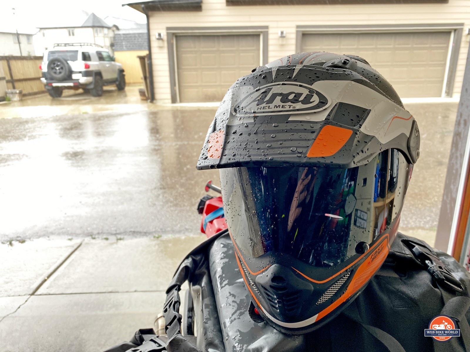 - The Klim visor took a small amount of damage just from being wiped by my gloves while riding in the rain, and the large gaps in the sun peak don’t protect it when fully raised like the Arai peak does either.