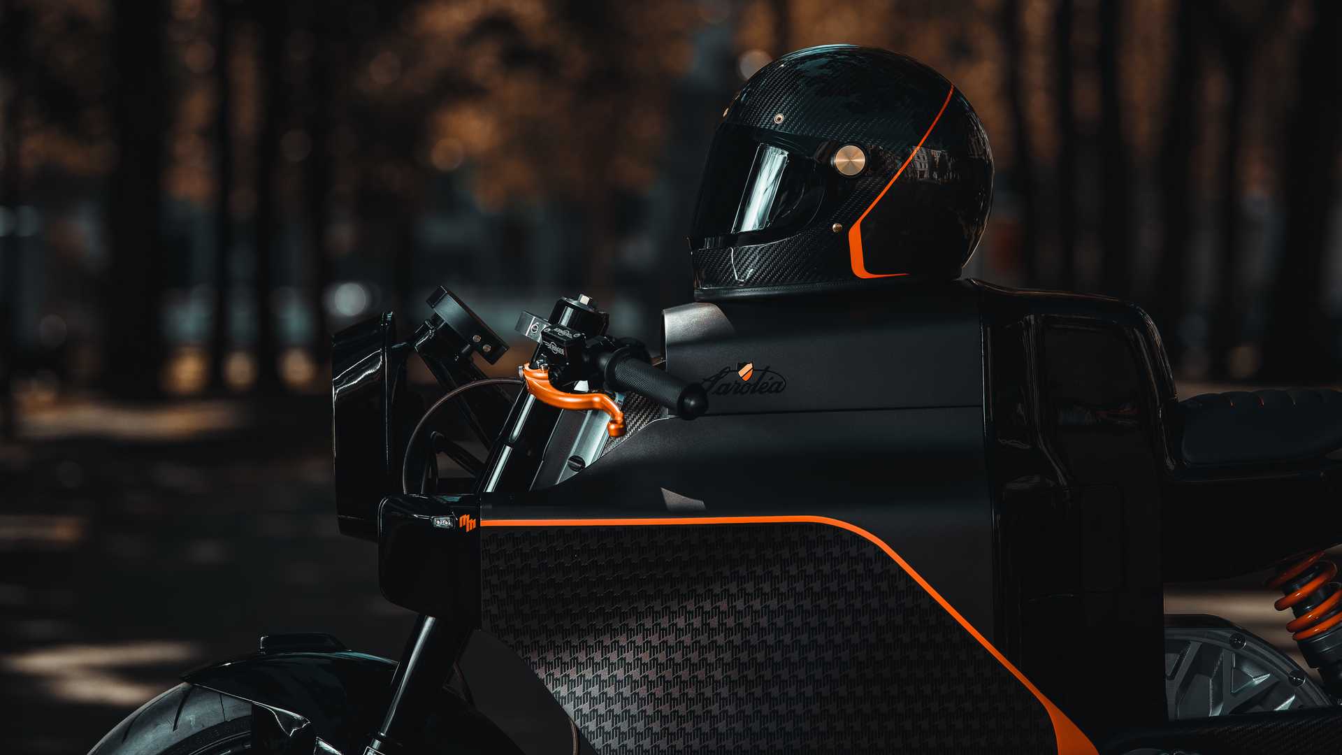 The Saroléa N60 can also be had with its own matching gear. Isn’t that cute? The company teamed up with Cafe Costume, helmet maker Hedon, and knife maker Studio Blade. The whole packages is a slim-cut “biker suit” that’s armored, a Hedon helmet and a carbon-fiber-handled Damascus steel fixed-blade knife from Studio Blade.