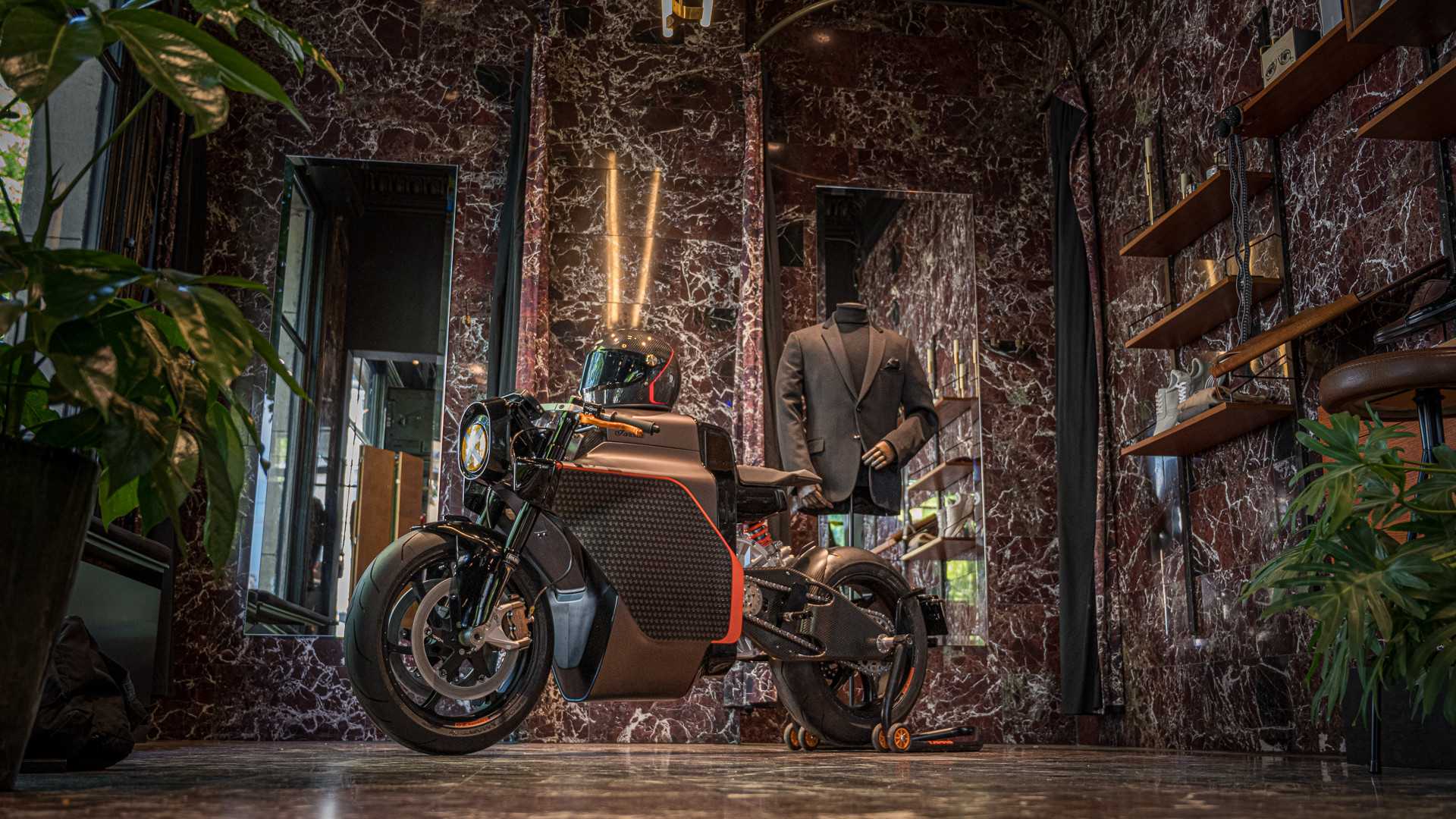 The bike has a thoroughly modern-looking design with a carbon fiber construction. The frame and all bodywork are carbon fiber. The bike weighs just 474 pounds and appears to be mostly battery. The battery is a 22kWh lithium-ion affair that fits in the center of the bike. It is supposed to be good for 205 miles of range per charge. It also offers DC quick-charging.