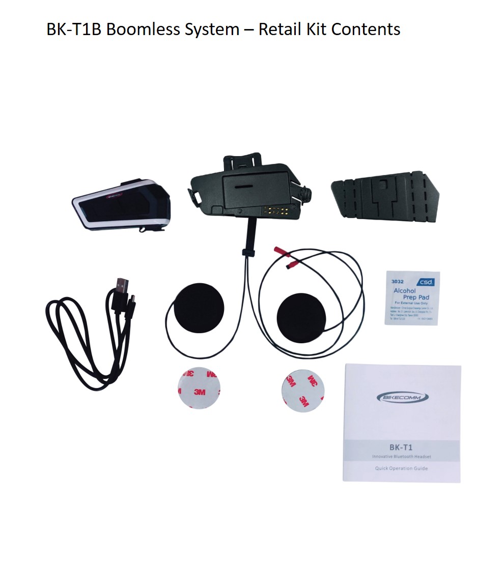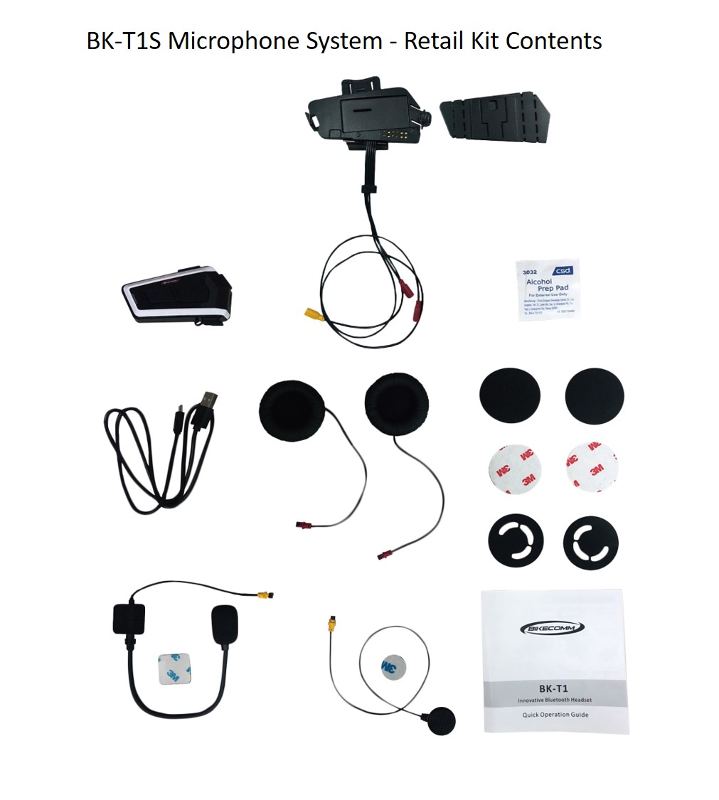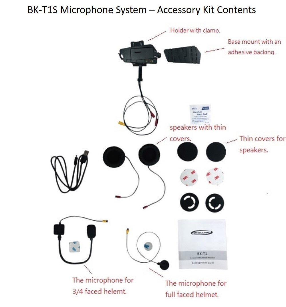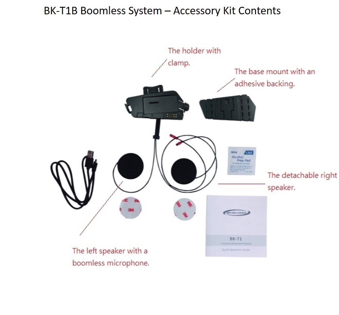 Includes the BK-T1 BT (with FM) module, the enhanced holder with the newly designed clamp mount, integrated harness for left and right detachable speakers, and detachable boom or thin wire microphone. The enhanced holder also works with the included adhesive-backed base mount allowing the user to choose between the two mounting options.