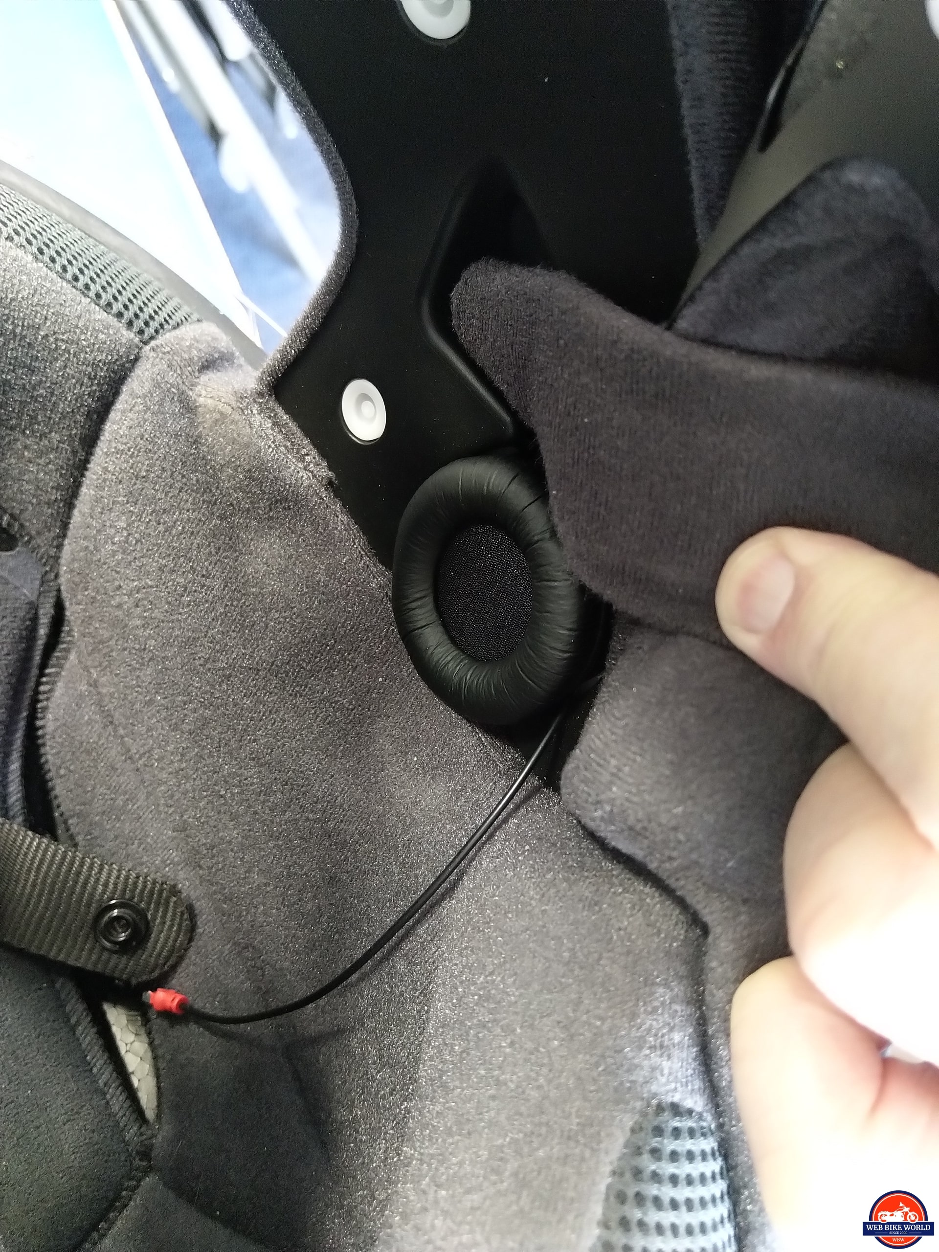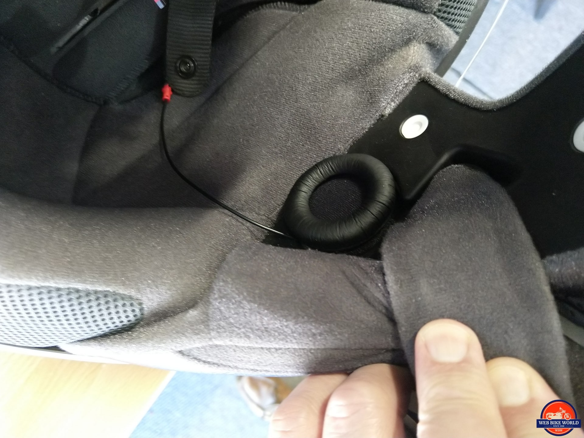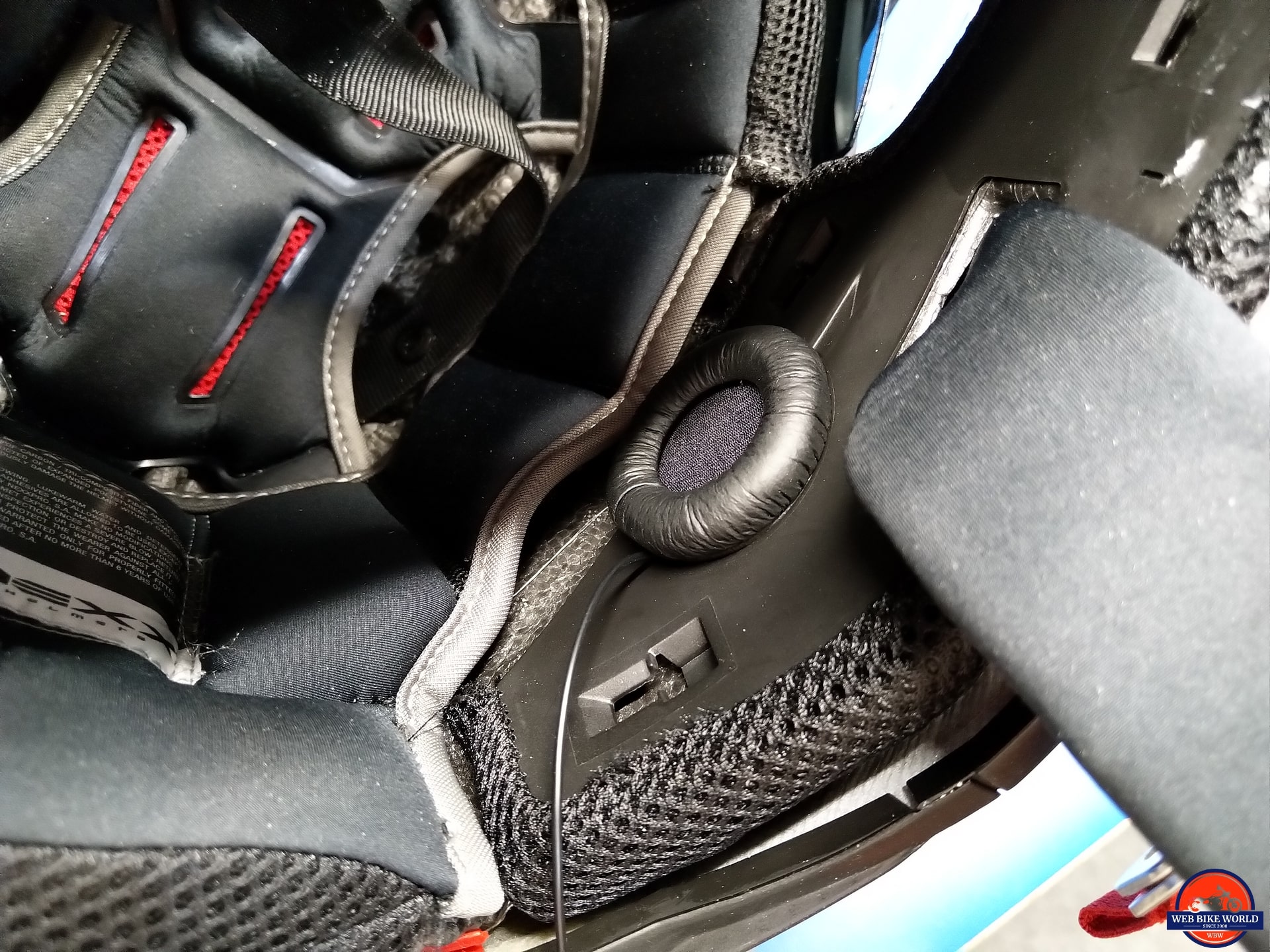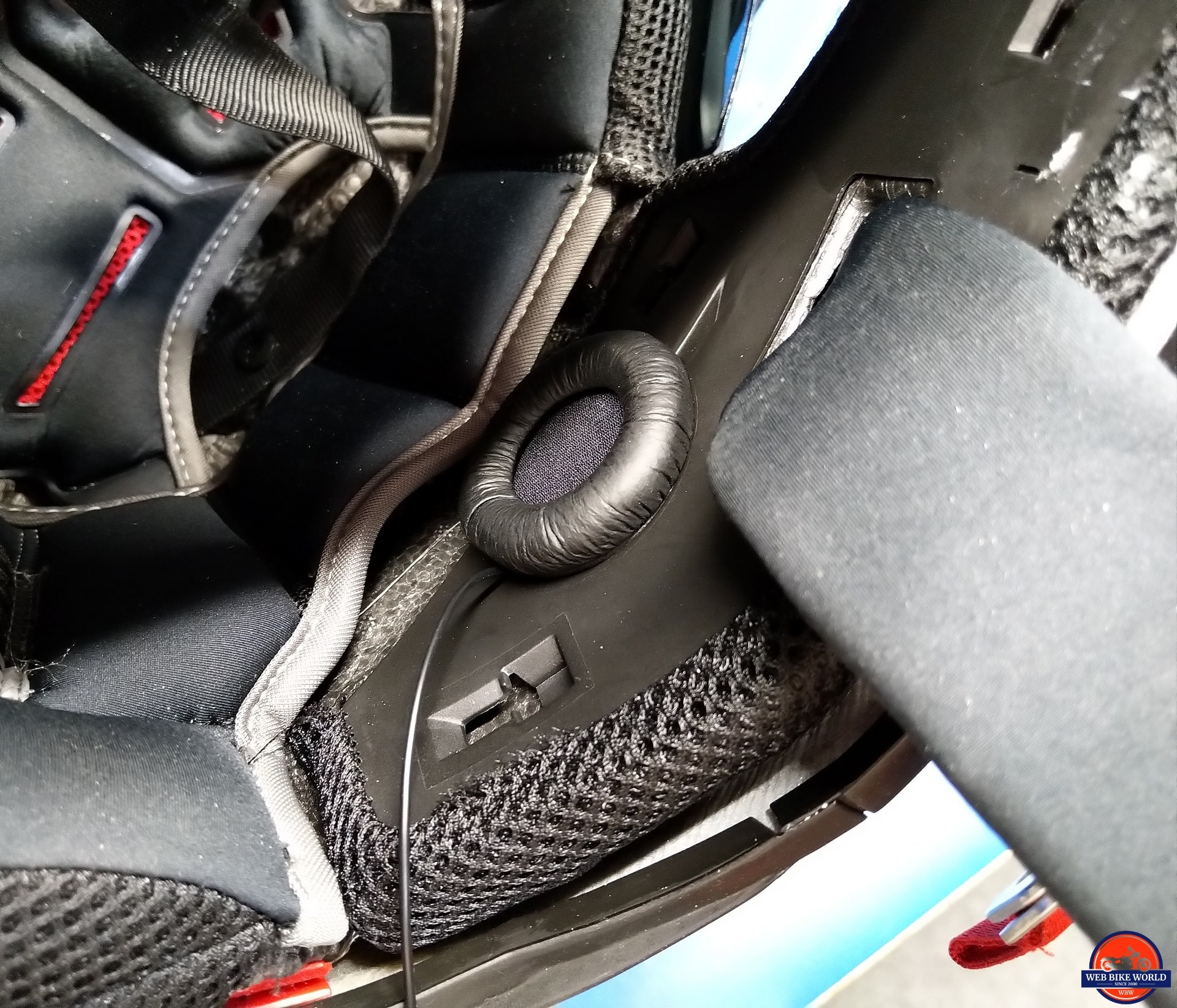As the first helmet up, options were tried on the NEXX X-Patrol Helmet regarding speakers. The thick padded covers are too thick (as seen below), but we have options.