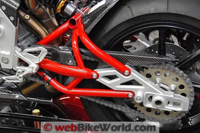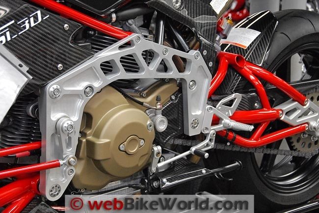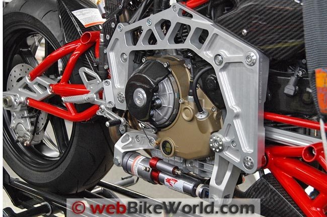 Also the front suspension has been radically redesigned and now uses a pull-rod mechanism with the hydraulic suspension located low beside the engine. Carbon body-parts and cowling, forged alloy wheels, and radial disc brakes are further features of the new Tesi 3D. The frame consists of light alloy.