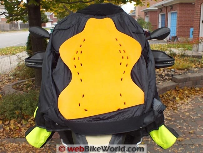The huge back pad covers most of the back area, shaped so that only shoulder and hip performance isn’t impeded. It carries a CE EN 1621-2/03 (( (Back/Spine Protective Armour) and NP-R2 Pro markings.