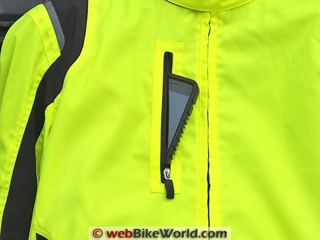 The front left and right side jacket pockets are deep, hold lots and keep the hands warm when needed; the vertical pocket on the upper left chest is deep enough for a large smartphone or phablet.