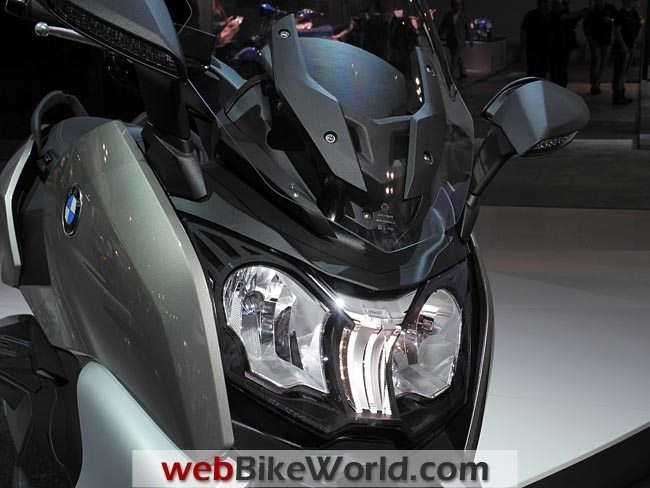 The C 650 GT likewise presents two headlights, but the side light and optional daytime running light take the form of three LED light elements arranged at the center.