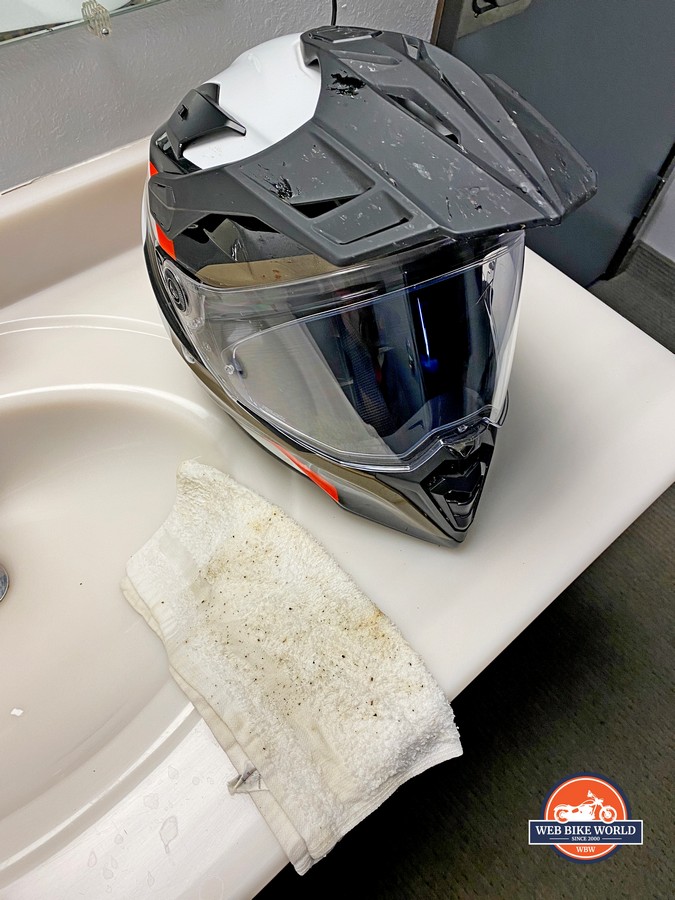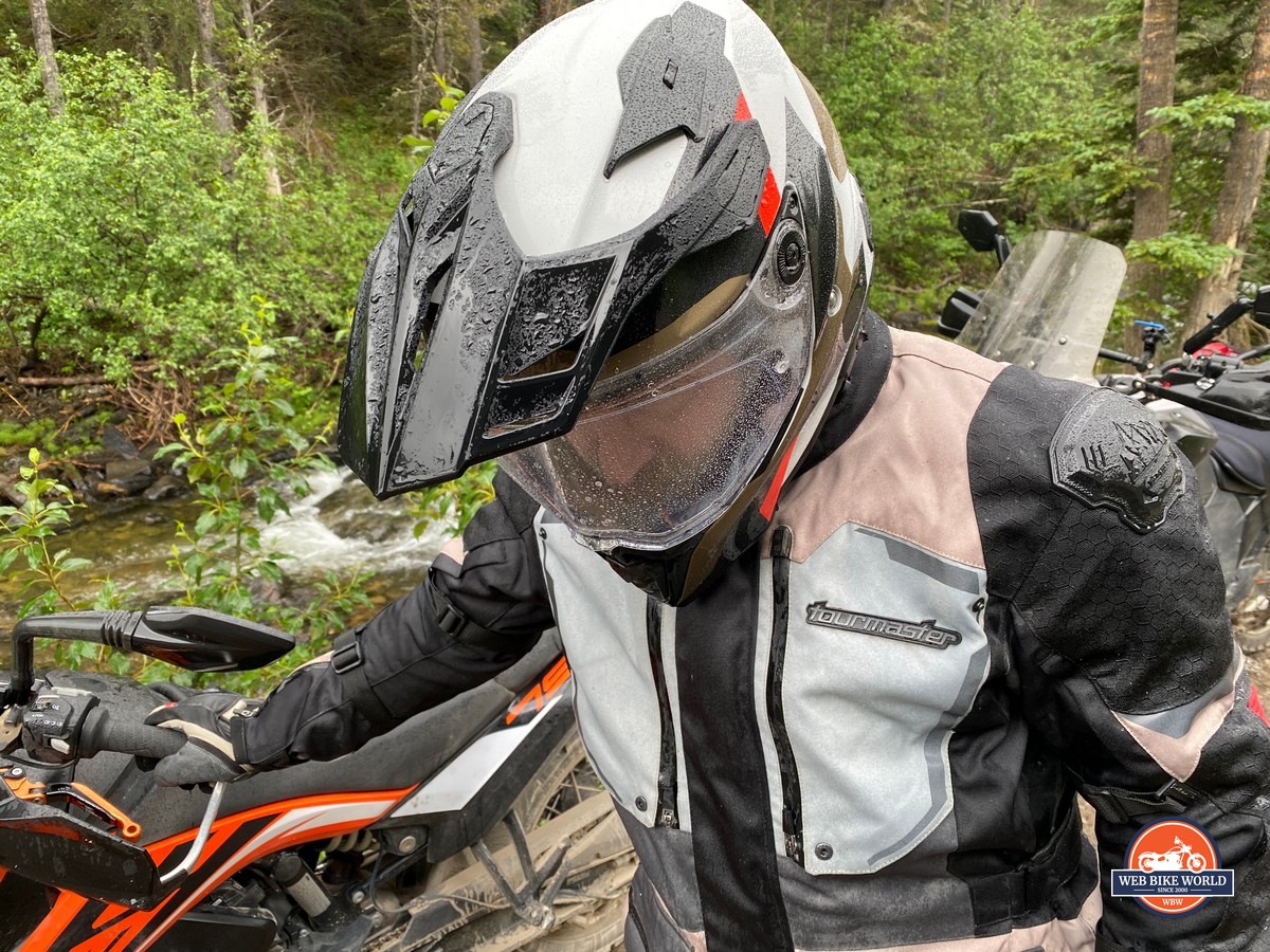 Testing included a few hours riding in light rain that fell constantly. It soaked the helmet exterior but no moisture passed through the visor seal or anywhere else other than the chin bar vent while it was open.