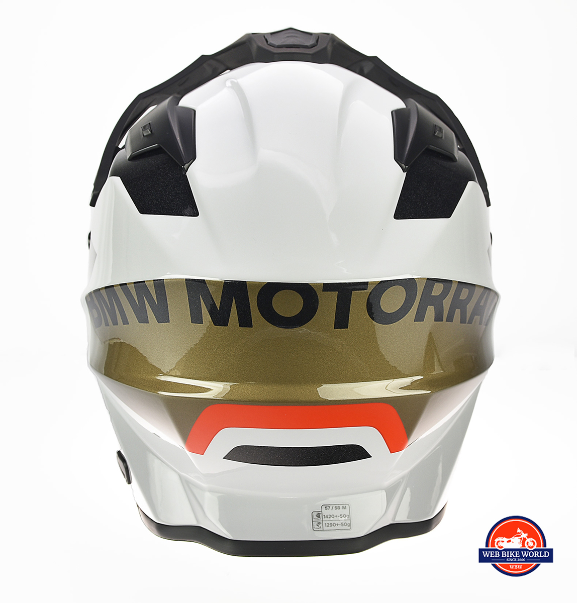 I like very much how the black BMW Motorrad script is subtly hidden in the brown patch on the back of the helmet with a bright red half-moon below it to draw the eye away from the brand name. They could have scattered blue and white checkered BMW propeller logos all over the exterior, but wisely didn’t in the name of having a distinguished look and showing understated good taste.