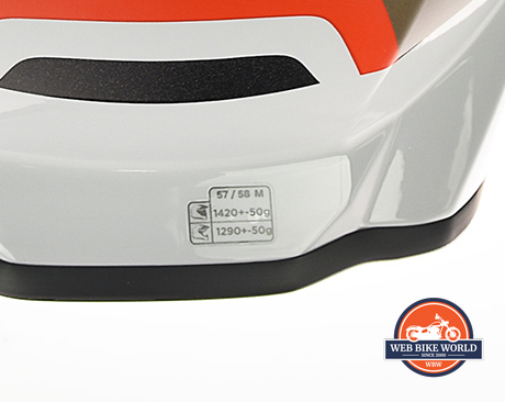 The Airoh Commander is also lightweight. It’s listed at 1430 g ±50 g or 3.15 lbs. My scale confirmed this Medium GS Pure weighs 3.1 lbs or 1406g. Not only is this a feather of a helmet, but the weight is distributed low in the shell. FYI, the second even lower weight printed on the helmet sticker in the photo above refers to when the visor is removed.