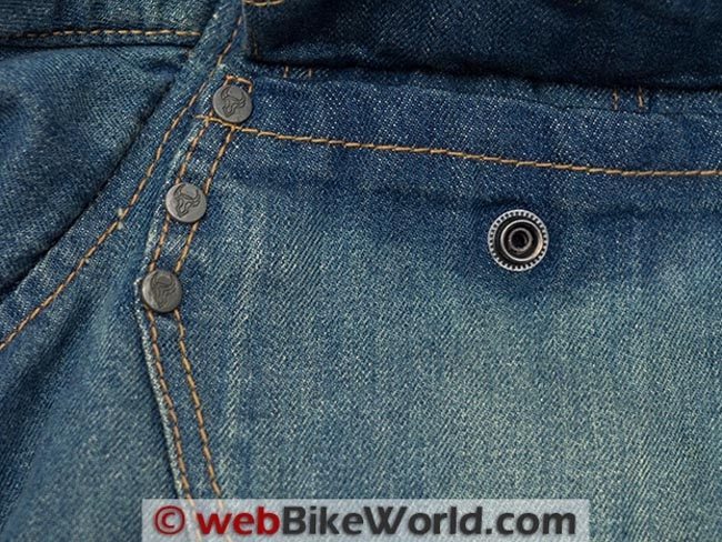 The Roadster jacket adds one more inside pocket on the right side that is closed with a plastic unbranded zipper set in denim.