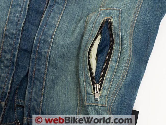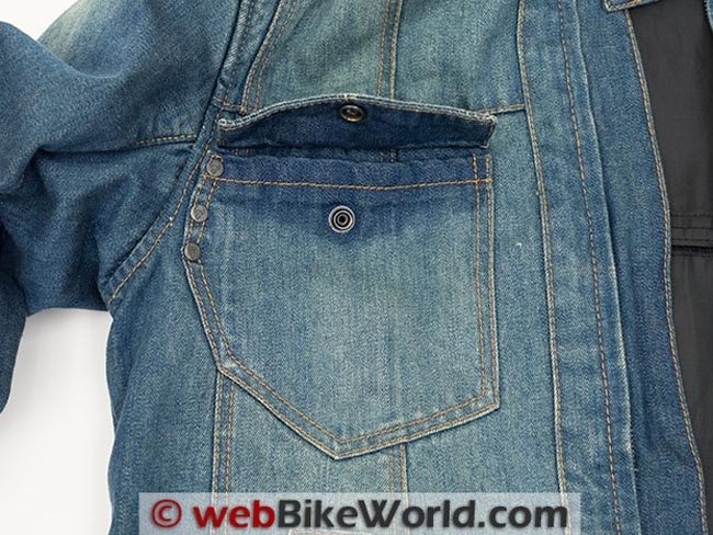 The two jackets have a small inside pocket with a hook and loop closure that is accessed from just behind the main zipper in the denim. Below that is another pocket sewn to the mesh lining also closed with hook and loop.