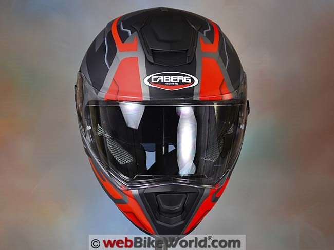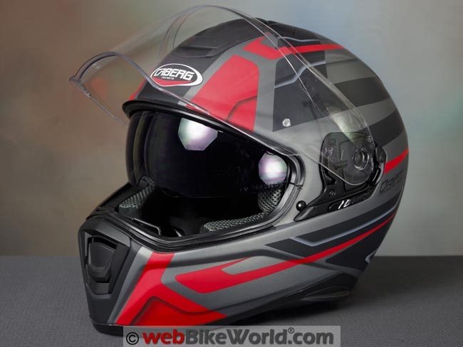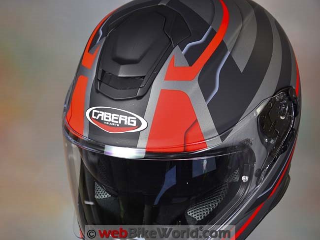 The face shield also has two lift tabs in the Caberg tradition and a lever at the rear that pushes the face shield open slightly for defogging.