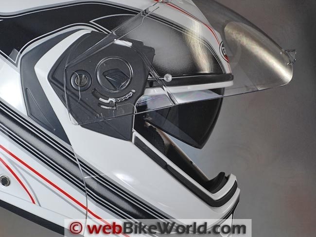 The face shield has five detents and the first is larger than we’d like for defogging, although the excellent defogging vent system and the anti-fog (and anti-scratch) treated face shield do an excellent job at defeating the mist.