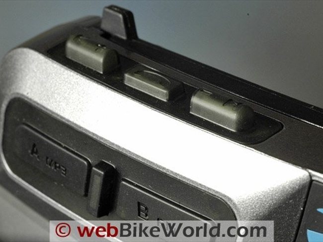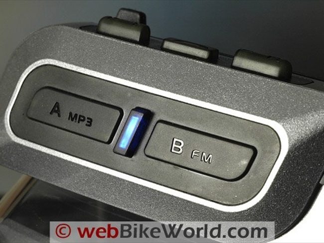 The two buttons on the side of the intercom module bracket the LED status light, which is bright and can’t be missed. The button marked “A” in front connects to another Scala Rider intercom and controls a connected MP3 player. The “B” button in the rear connects to a second Scala Rider intercom and controls the built-in FM radio.