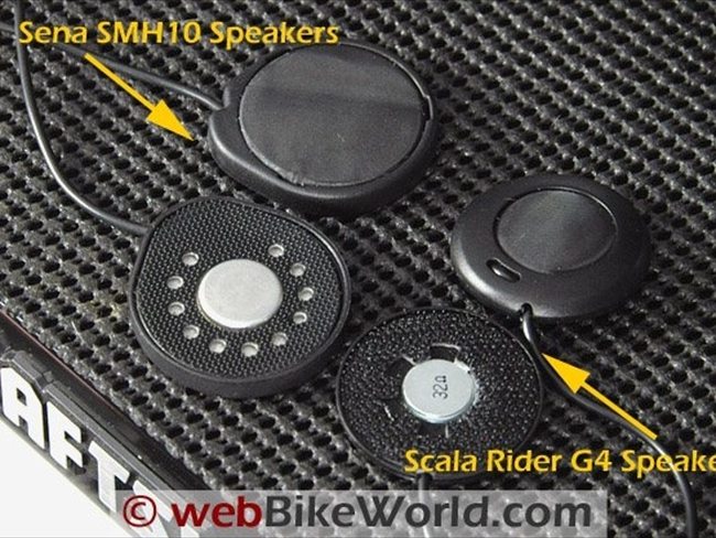 Thinking back, we should have used our decibel meter to compare the sound levels of the Sena and Interphone F4 with the Scala Rider G4 but the other units are presently out on the road. The G4 speakers are smaller and lighter than the speakers on the Sena SMH10 (7 g vs. 10 g and 35 mm in diameter by 2.5 mm thick vs. 40 mm in diameter and 6 mm thick for the Sena), but they provide about the same excellent sound quality and volume.