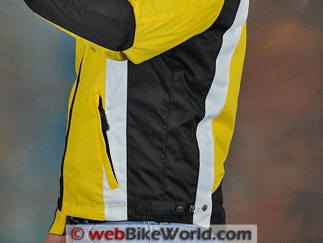 The same rubber-covered metal snaps are found along the lower jacket hem at the sides. A snap on a non-elastic strap provides three levels of adjustment for the hem.